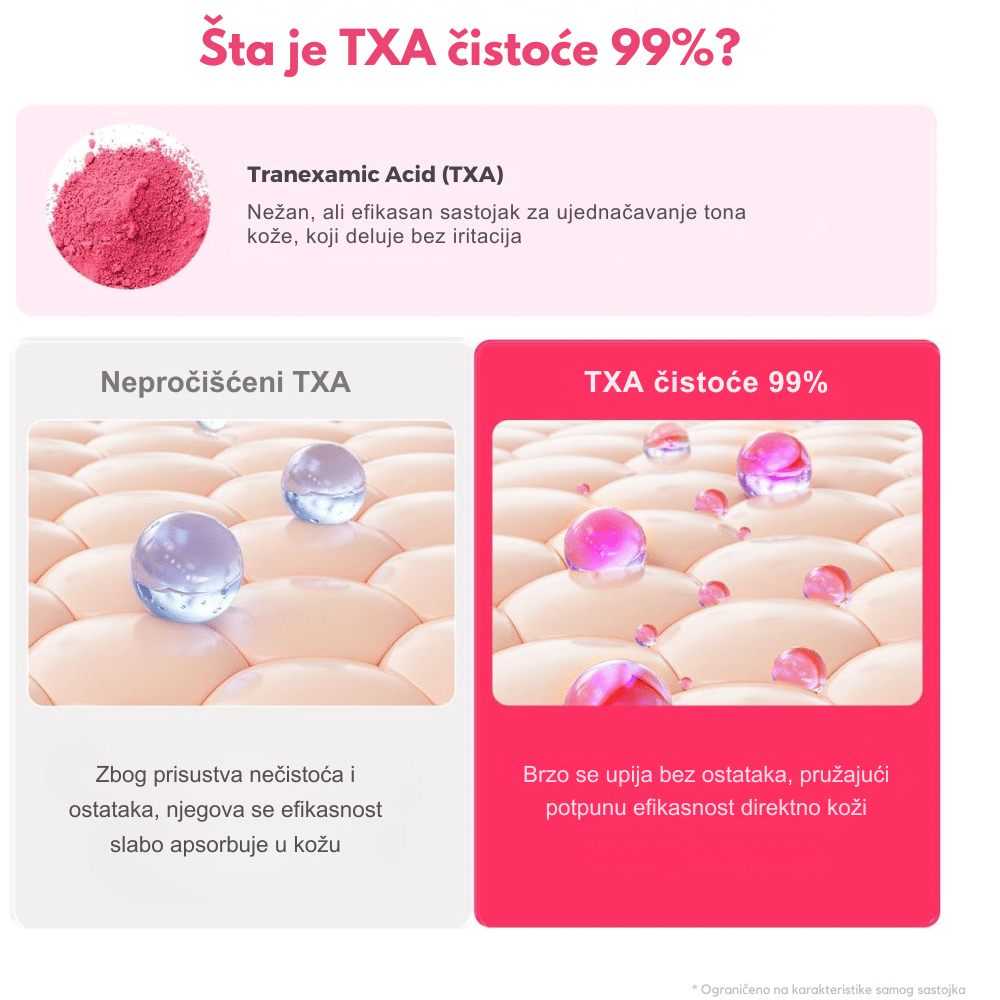 Traneksamična kiselina (TXA) je moćan sastojak poznat po svojoj sposobnosti da smanji hiperpigmentaciju, ujednači ten i ublaži crvenilo. Deluje tako što inhibira proizvodnju melanina, što je čini efikasnom u tretiranju melazme, tamnih mrlja i postinflamatorne hiperpigmentacije. Takođe ima antiinflamatorna svojstva, pa pomaže kod iritirane kože i jačanja barijere. Najčešće se koristi u serumima i kremama, često u kombinaciji sa niacinamidom, arbutinom ili vitaminom C, a za maksimalne rezultate preporučuje se redovna upotreba uz SPF zaštitu.