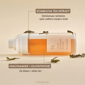 Kombucha je fermentisani sastojak dobijen fermentacijom crnog ili zelenog čaja uz pomoć simbiotičke kulture bakterija i kvasaca. Bogata je probioticima, vitaminima B, polifenolima i organskim kiselinama, što je čini moćnim sastojkom za detoksikaciju, hidrataciju i jačanje kožne barijere. Pomaže u uravnoteženju mikrobioma kože, smanjenju oksidativnog stresa i poboljšanju elastičnosti, dok antioksidansi pomažu u borbi protiv preranog starenja. Takođe doprinosi posvetljavanju tena i ujednačavanju teksture kože, pa se često koristi u serumima, tonerima i esencijama, posebno za umornu i beživotnu kožu kojoj je potrebna dodatna revitalizacija.
