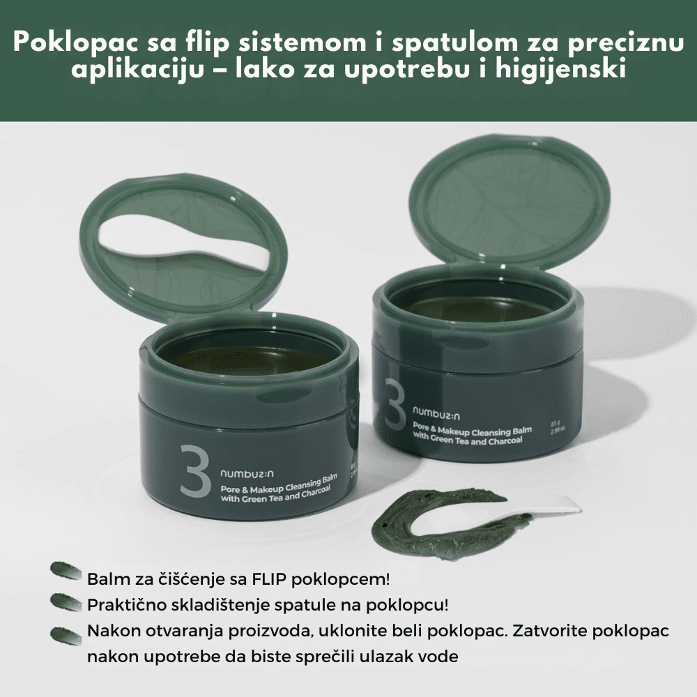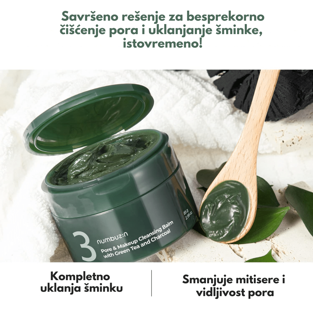 Numbuzin No.3 Pore & Makeup Cleansing Balm With Green Tea And Charcoal je dubinski čistač u balzamu koji efikasno uklanja šminku, nečistoće i višak sebuma dok istovremeno čisti pore. Formulisan sa ekstraktom zelenog čaja, aktivnim ugljem i hijaluronskom kiselinom, ovaj balzam detoksikuje, osvežava i hidrira kožu bez isušivanja. Njegova tekstura se topi u dodiru sa kožom, pretvarajući se u svileno ulje koje temeljno čisti i ostavlja kožu mekom, čistom i uravnoteženom. Idealno za svakodnevno čišćenje i sve tipove kože, naročito za masnu i kožu sa proširenim porama.