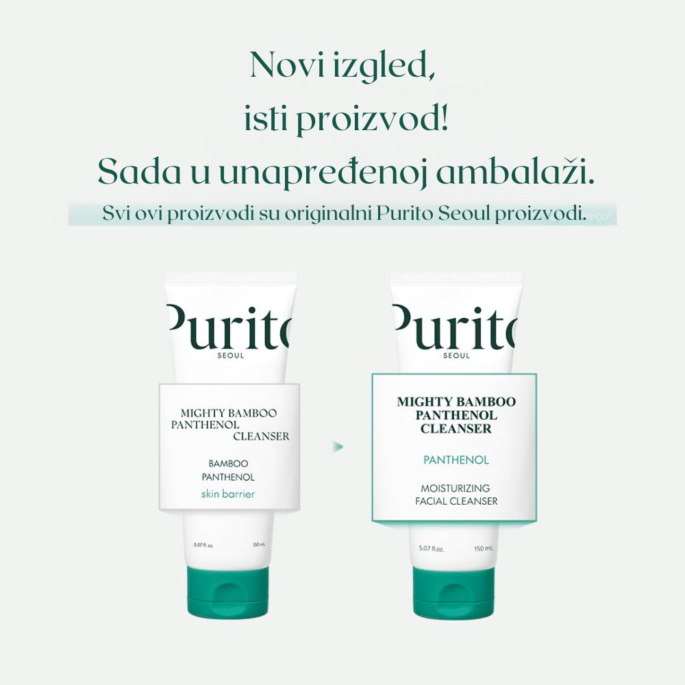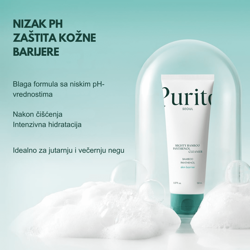 Purito Seoul Mighty Bamboo Panthenol Cleanser 150ml je blagi gel za čišćenje lica formulisan sa ekstraktom bambusa i pantenolom, koji nežno uklanja nečistoće i višak sebuma dok hidrira i umiruje kožu. Ekstrakt bambusa bogat je antioksidansima koji štite kožu od spoljašnjih agresora, dok pantenol jača kožnu barijeru i smanjuje iritacije. Njegova pH-uravnotežena formula ne isušuje kožu, čineći je glatkom, svežom i osveženom nakon svakog pranja. Idealan je za sve tipove kože, uključujući osetljivu i suvu kožu.