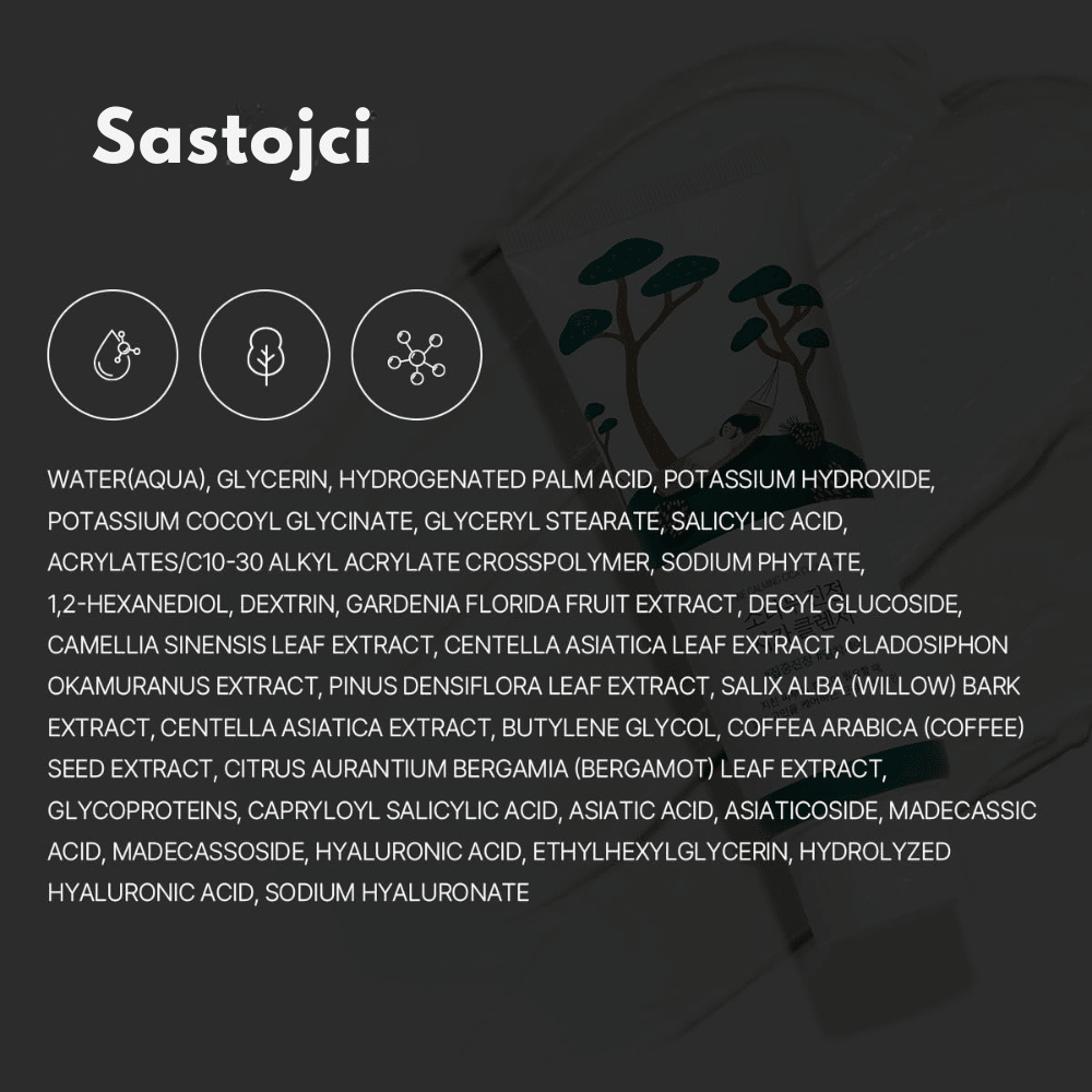 Water, Glycerin, Hydrogenated Palm Acid, Potassium Hydroxide, Potassium Cocoyl Glycinate, Camellia Sinensis Leaf Extract, Cladosiphon Okamuranus Extract, Salix Alba (Willow) Bark Extract, Coffea Arabica (Coffee) Seed Extract, Citrus Aurantium Bergamia (Bergamot) Leaf Extract, Salicylic Acid, Centella Asiatica Leaf Extract (10.6 ppm), Pinus Densiflora Leaf Extract (10.6 ppm), Centella Asiatica Extract (10 ppm), Hyaluronic Acid, Hydrolyzed Hyaluronic Acid, Sodium Hyaluronate, Butylene Glycol, Ethylhexylglycerin, Gardenia Florida Fruit Extract, Glycoproteins (0.2 ppm), Capryloyl Salicylic Acid, Asiatic Acid (0.01 ppm), Asiaticoside (0.01 ppm), Madecassic Acid (0.01 ppm), Madecassoside (0.01 ppm), Glyceryl Stearate, Dextrin, Decyl Glucoside, Acrylates/C10-30 Alkyl Acrylate Crosspolymer, 1,2-Hexanediol, Sodium Phytate.
