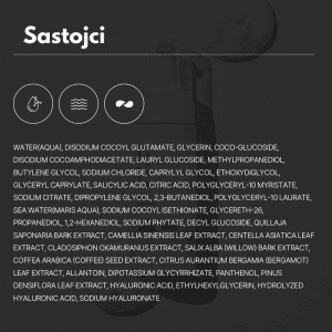 Proizvod sadrži vodu, Disodium Cocoyl Glutamate, Glycerin, Coco-Glucoside, Disodium Cocoamphodiacetate, Lauryl Glucoside, hijaluronsku kiselinu u tri različite forme (Water, Hydrolyzed i Sodium Hyaluronate), Salix Alba (vrba) Bark Extract, Camellia Sinensis Leaf Extract, Centella Asiatica Leaf Extract, Pinus Densiflora Leaf Extract, Citrus Aurantium Bergamia Leaf Extract, Coffea Arabica Seed Extract, morsku vodu, Panthenol, Allantoin, Salicylic Acid, eterična ulja i druge pomoćne sastojke koji obnavljaju i smiruju kožu