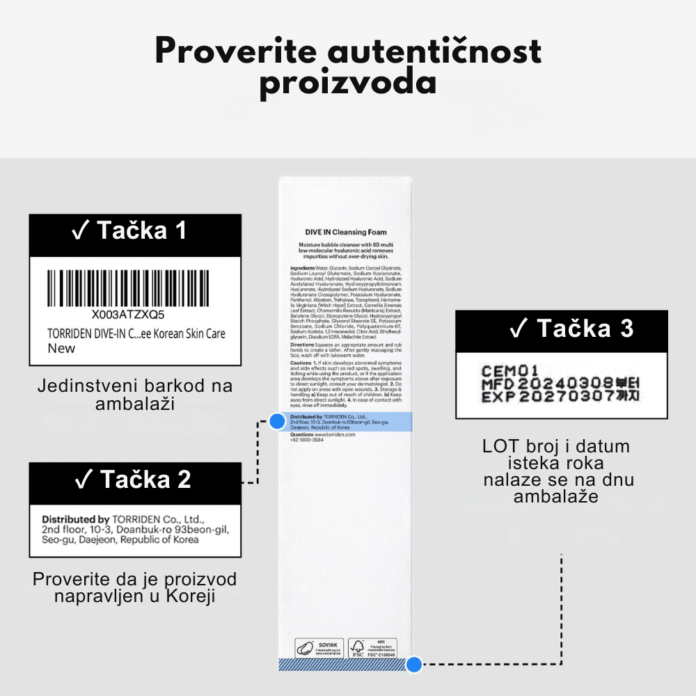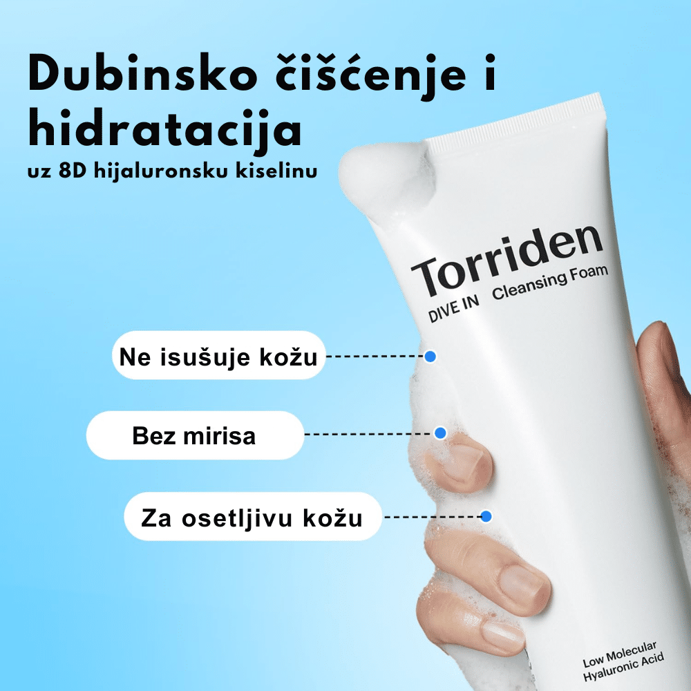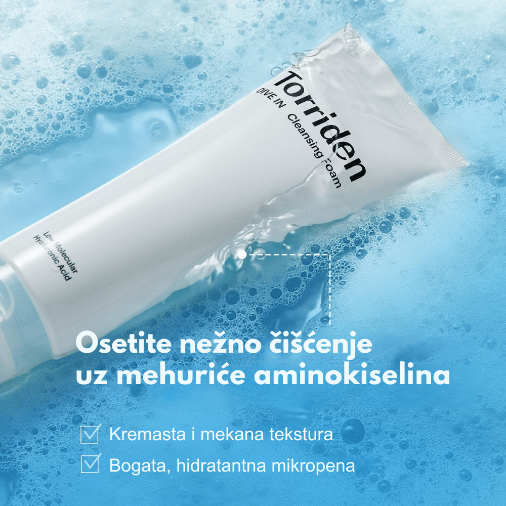 Torriden DIVE IN Cleansing Foam je bogata, kremasta pena za čišćenje koja temeljno uklanja nečistoće i višak sebuma, dok zahvaljujući 8-dimenzionalnom hijaluronskom kompleksu pruža dubinsku hidrataciju i sprečava osećaj suvoće. Formulisana za osetljivu kožu, ova pena ostavlja lice čisto, sveže i prijatno hidrirano.