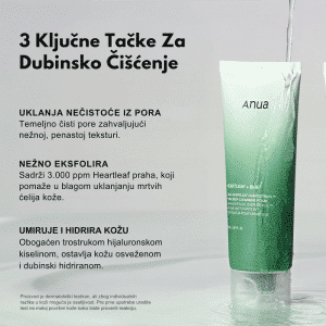 Anua je južnokorejski kozmetički brend poznat po veganskim proizvodima koji kombinuju prirodne sastojke za efikasnu i nežnu negu kože. Njihova filozofija naglašava važnost brige o sebi i balansiranog pristupa u postizanju zdrave i blistave kože.. Proizvodi su formulisani bez nepotrebnih dodataka, fokusirajući se na esencijalne sastojke kako bi pružili rešenja za različite probleme kože. Jedan od ključnih sastojaka u Anua proizvodima je ekstrakt biljke Houttuynia cordata, poznat po antioksidativnim i antiinflamatornim svojstvima, koji pomaže u umirivanju kože i regulaciji sebuma, što ga čini idealnim za masnu i kožu sklonu aknama. Brend se takođe zalaže za etičke i održive prakse; svi proizvodi su cruelty-free i dolaze u ekološki prihvatljivoj ambalaži.