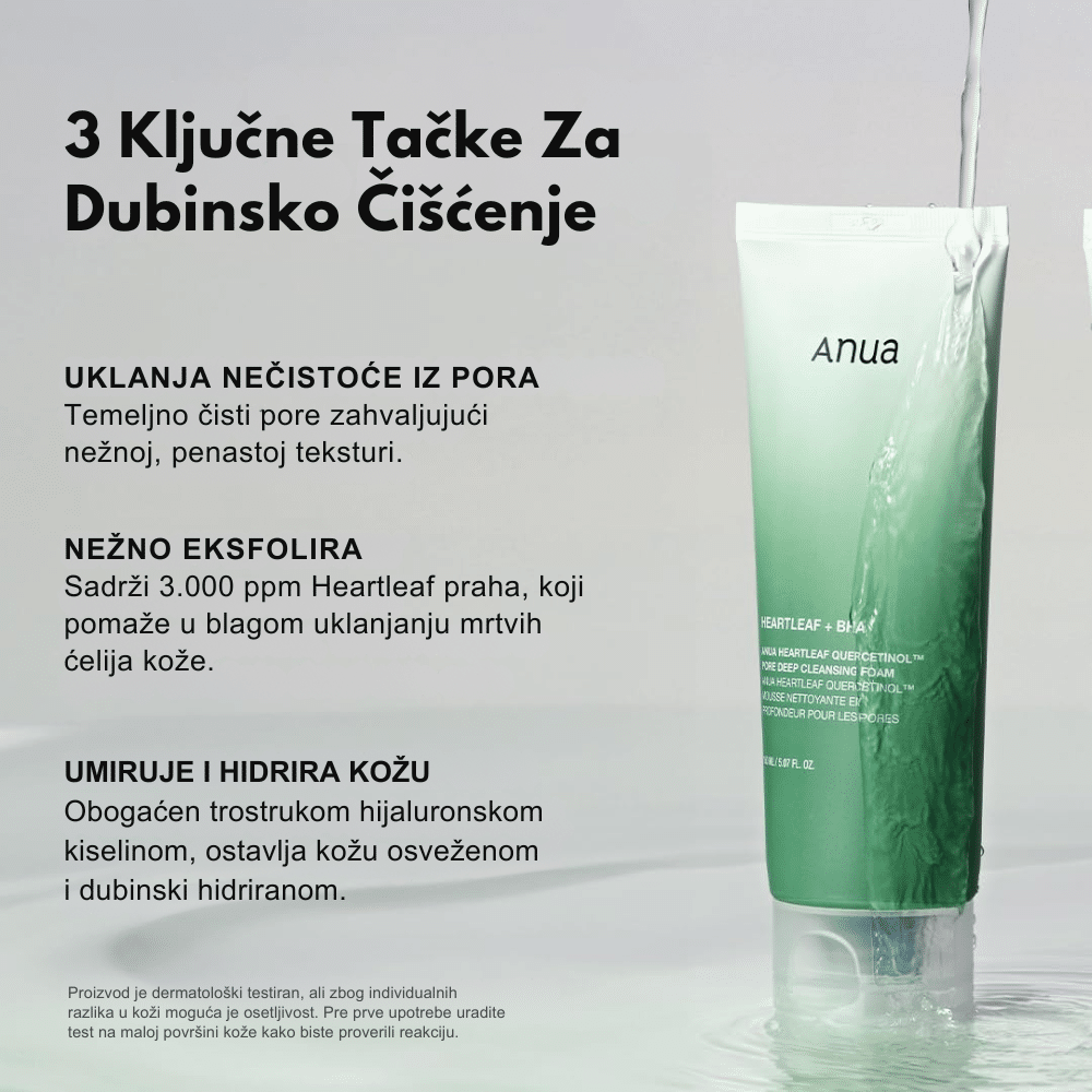 Anua Heartleaf Quercetinol Pore Deep Cleansing Foam je penušavi čistač za lice formulisan da dubinski očisti pore i ukloni nečistoće, dok istovremeno umiruje i neguje kožu.