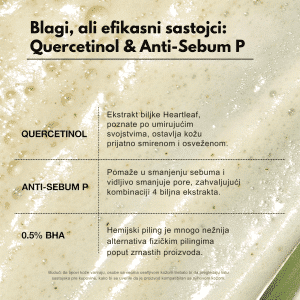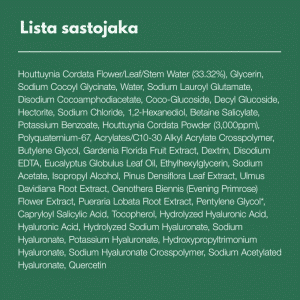 Heartleaf (Houttuynia cordata) je biljka poznata po svojim moćnim umirujućim i antiinflamatornim svojstvima, što je čini popularnim sastojkom u kozmetici. Bogata je antioksidansima, taninima i polisaharidima, koji pomažu u smanjenju crvenila, iritacije i upala na koži. Heartleaf takođe deluje antibakterijski i pomaže u kontroli viška sebuma, što ga čini idealnim za negu masne, osetljive i aknama sklone kože. Zahvaljujući svojim detoks svojstvima, doprinosi čistijem i ujednačenijem tenu