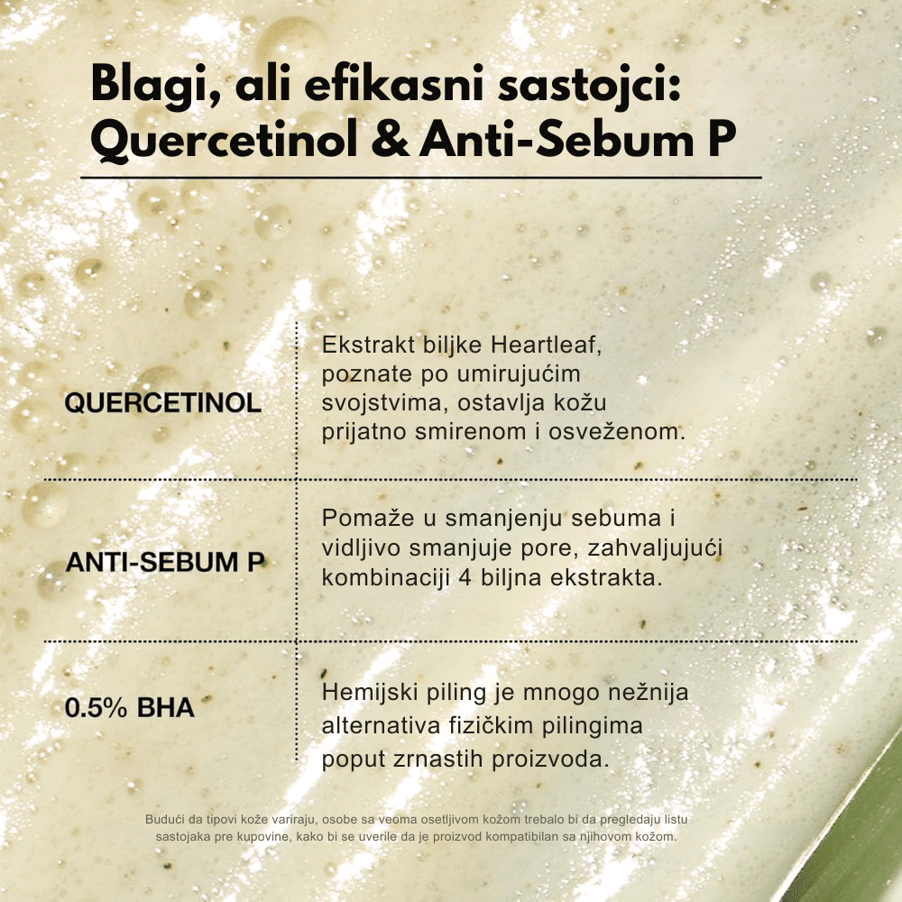 Formulacija sadrži 0,5% BHA (beta-hidroksi kiselina) koja efikasno uklanja nečistoće iz pora i smanjuje njihovu vidljivost. Obogaćen sa 3.000ppm ekstrakta biljke Heartleaf koja pomaže u nežnom uklanjanju mrtvih ćelija kože, poboljšavajući njenu teksturu. Obogaćena Quercetinolom, ekstraktom iz Heartleaf-a poznatim po umirujućim svojstvima, i trostrukom hijaluronskom kiselinom koja pruža hidrataciju, ostavljajući kožu osveženom i hidriranomi. Njegova kremasta pena nežno uklanja višak ulja i ostatke šminke, ostavljajući kožu svežom, glatkom i hidriranom. Idealan za svakodnevnu upotrebu, posebno za masnu, kombinovanu i problematičnu kožu.