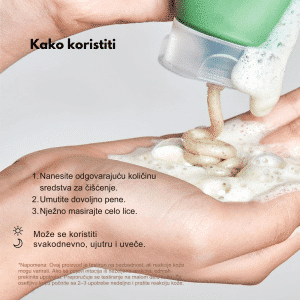 Na vlažne dlanove nanesite malu količinu čistača i utrljajte dok se ne formira bogata pena. Nanesite penu na lice, masirajući kružnim pokretima, a zatim temeljno isperite mlakom vodom. Koristite ujutru i uveče kao deo vaše rutine nege kože. Izbegavajte kontakt sa očima. Ako dođe do iritacije, prekinite upotrebu i konsultujte se sa dermatologom.