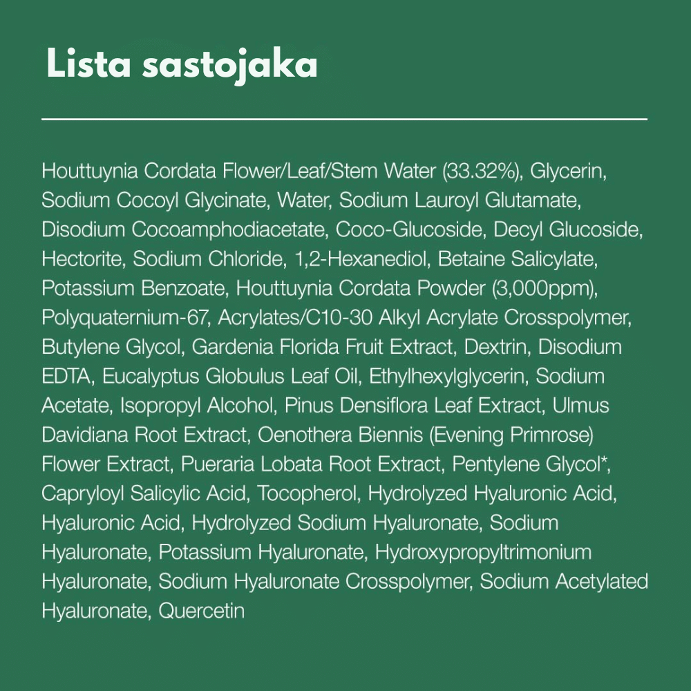 Houttuynia Cordata Extract (33.4%), Quercetin (10,000 Ppb), Glycerin, Sodium Cocoyl Glycinate, Water, Sodium Lauroyl Glutamate, Coco-Glucoside, Sodium Cocoamphoacetate, Sodium Chloride, 1,2-Hexanediol, Salicylic Acid, Butylene Glycol, Lecithin, Glyceryl Stearate SE, Hydroxypropyl Starch Phosphate, Potassium Benzoate, Polyquaternium-67, Houttuynia Cordata Powder, Oenothera Biennis (Evening Primrose) Flower Extract, Ulmus Davidiana Root Extract, Pinus Palustris Leaf Extract, Pueraria Lobata Root Extract, Capryloyl Salicylic Acid, Tocopherol, Sodium Hyaluronate, Hydroxypropyltrimonium Hyaluronate, Sodium Acetylated Hyaluronate, Hydrolyzed Hyaluronic Acid, Hyaluronic Acid, Sodium Hyaluronate Crosspolymer, Hydrolyzed Sodium Hyaluronate, Potassium Hyaluronate, Dextrin, Gardenia Florida Fruit Extract, Fragrance, Ethylhexylglycerin, Disodium EDTA.