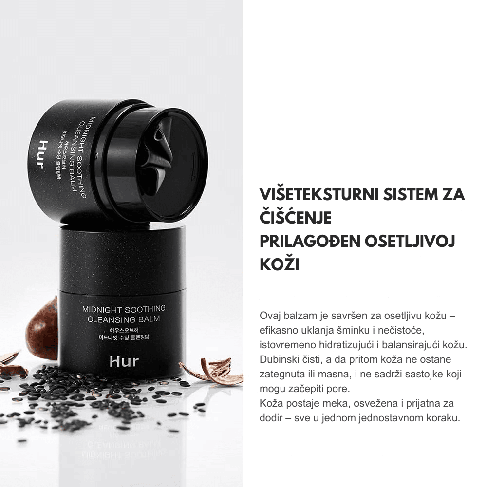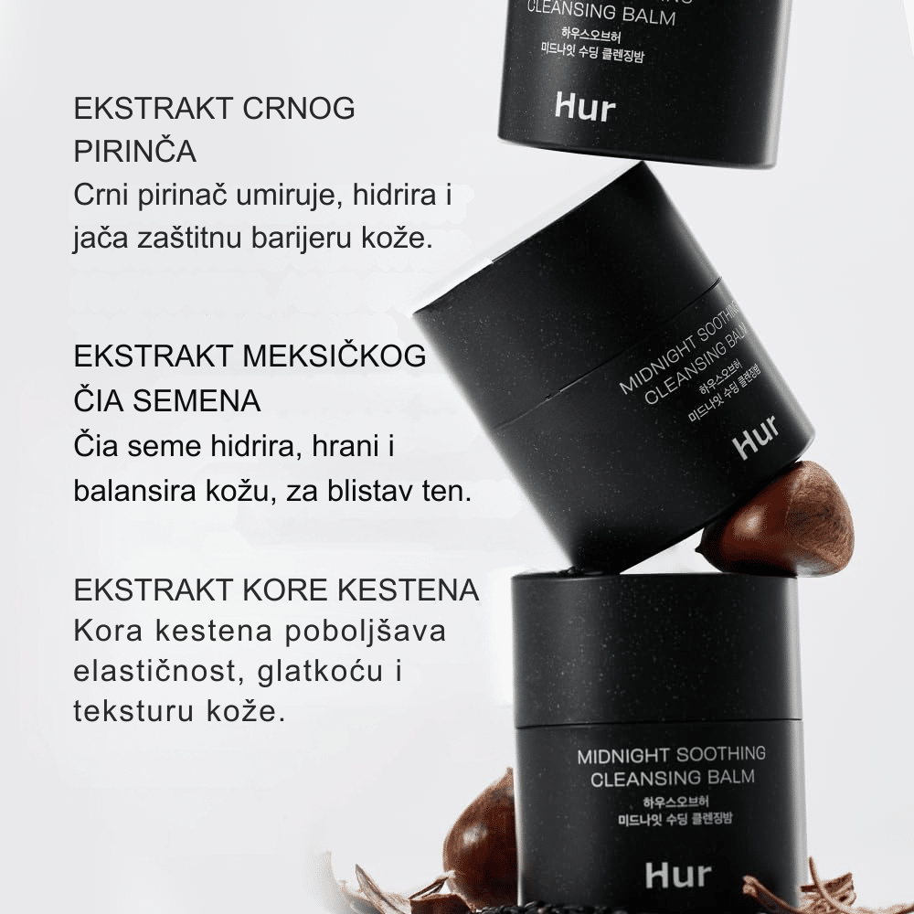 HOUSE OF HUR Midnight Soothing Cleansing Balm je nežni balzam za čišćenje koji efikasno uklanja šminku, SPF i nečistoće bez narušavanja prirodne barijere kože. Svilenkasta tekstura se topi u dodiru sa kožom, ostavljajući je čistom, mekom i umirenom nakon umivanja.