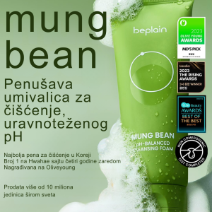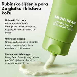 Beplain Mung Bean pH-Balanced Cleansing Foam je nežna pena-čistač s ekstraktom zelenog pasulja koja balansira pH kože (~5.5) i efikasno uklanja nečistoće, višak sebuma i tragove šminke, dok istovremeno čuva hidriranost i udobnost kože.