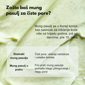 Mungo pasulj (Mung Bean), poznat i kao *Vigna radiata*, bogat je antioksidansima, vitaminima i mineralima koji doprinose zdravlju i izgledu kože. U kozmetici se koristi zbog svojih umirujućih, osvežavajućih i detoksikujućih svojstava, pomažući u smanjenju crvenila, čišćenju pora i poboljšanju teksture kože. Zahvaljujući visokom sadržaju polifenola i flavonoida, deluje kao snažan antioksidans koji štiti kožu od oksidativnog stresa i prevremenog starenja. Najčešće se nalazi u maskama za lice, pilingima i sredstvima za čišćenje kože, jer pomaže u uklanjanju nečistoća, višak sebuma i odumrlih ćelija, ostavljajući kožu glatkom i osveženom. Njegova hidratantna i umirujuća svojstva čine ga pogodnim za osetljivu i problematičnu kožu, dok istovremeno doprinosi zdravijem i blistavijem tenu.