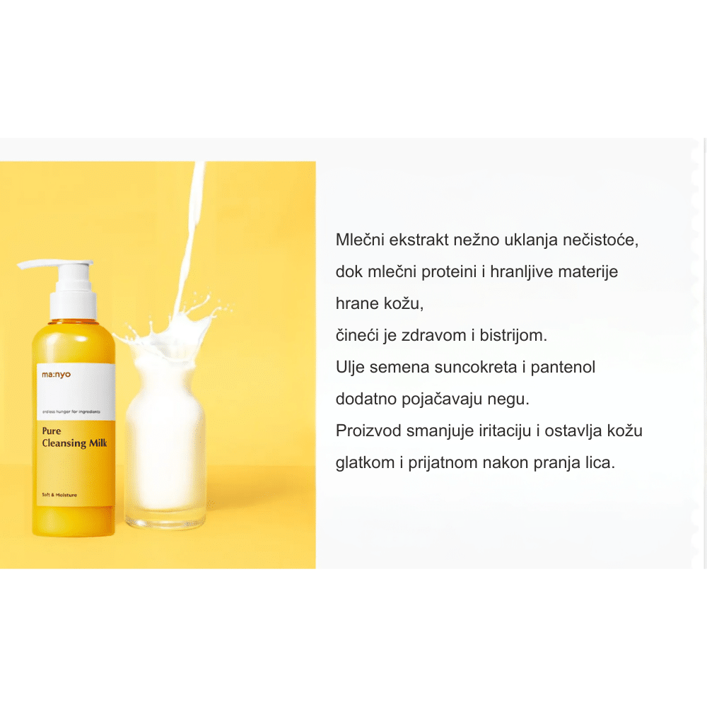 Ma:nyo Pure Cleansing Milk je blago mleko za čišćenje koje efikasno uklanja nečistoće i šminku bez isušivanja kože. Pogodno je za suvu i osetljivu kožu, ostavljajući je mekom i hidriranom.