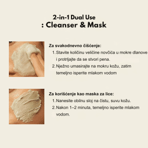 Na vlažnu kožu lica nanesite malu količinu proizvoda, umasirajte kružnim pokretima dok ne osetite nežnu penu, zatim isperite mlakom vodom. Po želji, može se ostaviti kao maska na 2-3 minuta pre ispiranja za dodatni efekt. Izbegavajte kontakt sa očima; u slučaju iritacije prekinite upotrebu.