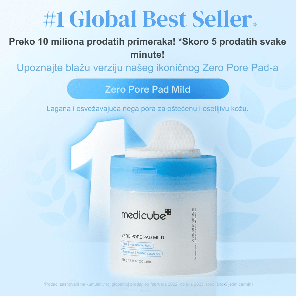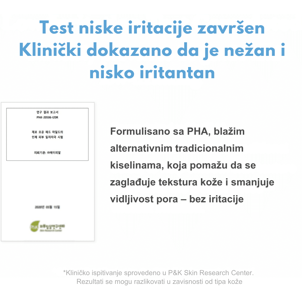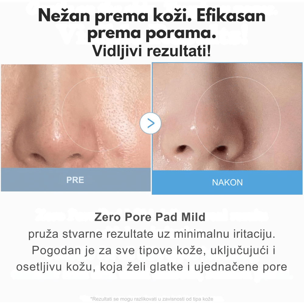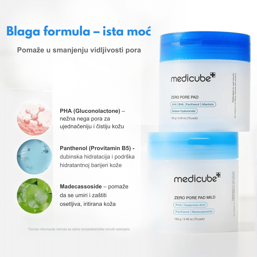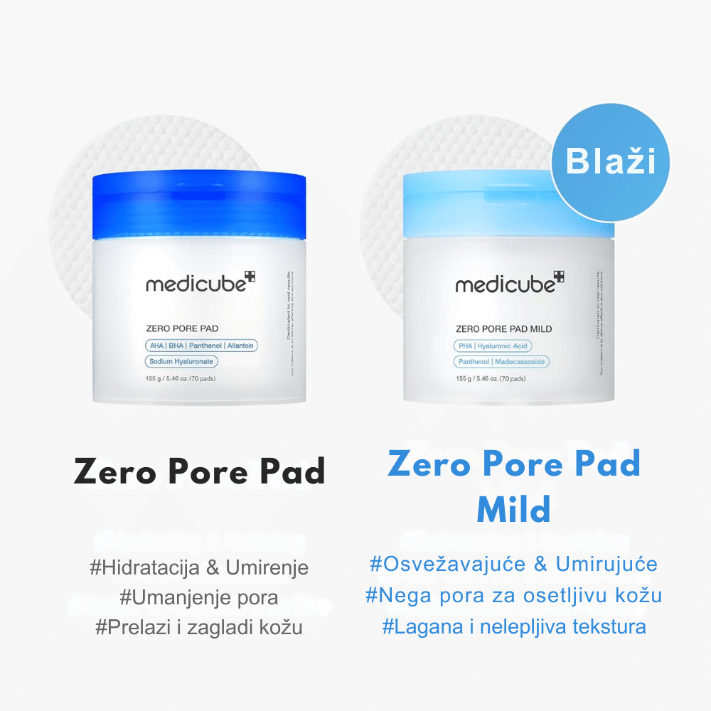 Medicube Zero Pore Pad Mild su blagi eksfolijacioni toneri u obliku jastučića koji nežno uklanjaju mrtve ćelije kože i višak sebuma, ostavljajući pore čistima i manje vidljivima. Formulisani bez alkohola i iritansa, idealni su za osetljivu kožu. Obogaćeni PHA kiselinama, ekstraktom hamamelisa i hijaluronskom kiselinom, pomažu u obnavljanju teksture kože, smanjenju crvenila i održavanju optimalne hidratacije. Redovnom upotrebom koža postaje glatkija, ujednačenija i vidno zdravija.