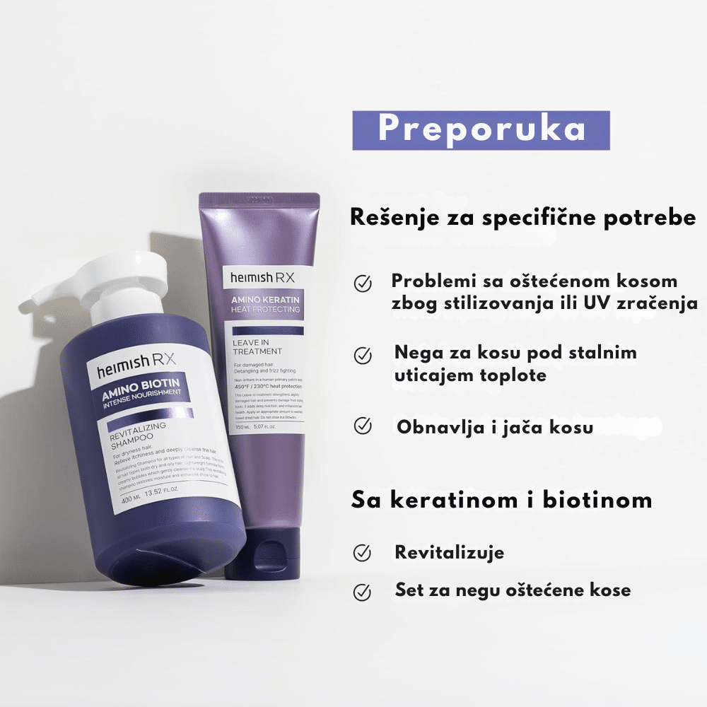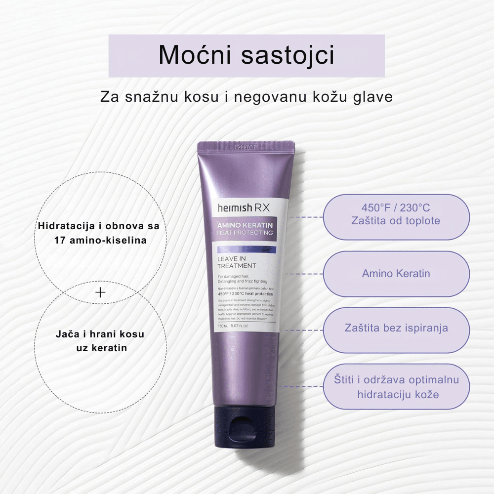 Heimish Rx Amino Keratin Heat Protecting Leave In Treatment pruža profesionalnu negu i zaštitu kose od toplote pri upotrebi fena, prese i figara. Formula obogaćena keratinom, aminokiselinama i proteinima svile dubinski hrani i jača vlas, obnavlja oštećene delove i vraća elastičnost i sjaj kosi. Lagana tekstura se brzo upija bez otežavanja, ostavljajući kosu glatkom, mekom i lakom za oblikovanje. Idealna je za svakodnevnu upotrebu i posebno efikasna kod suve, farbane i hemijski tretirane kose.