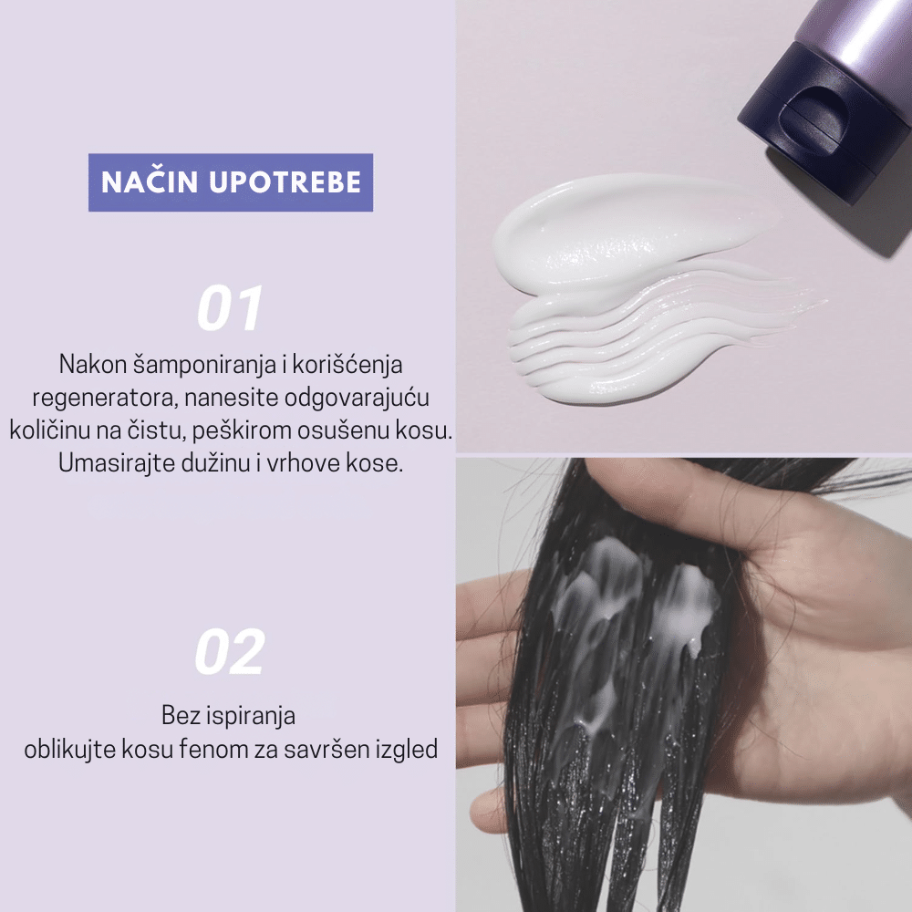 Na čistu, peškirom prosušenu kosu naneti malu količinu proizvoda i ravnomerno rasporediti po dužini i krajevima. Ne ispirati. Nastaviti sa feniranjem ili stilizovanjem kao i obično. Može se koristiti svakodnevno, pre svake upotrebe toplotnih uređaja. Izbegavati nanošenje direktno na teme.