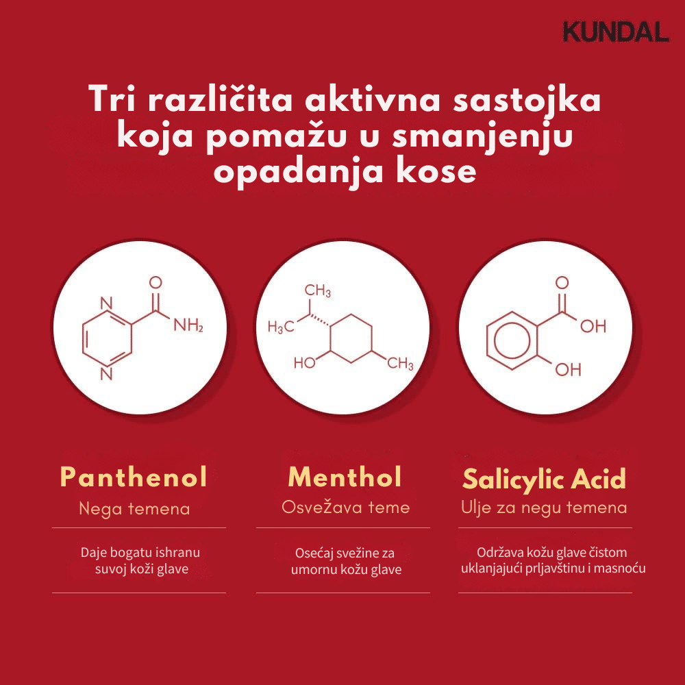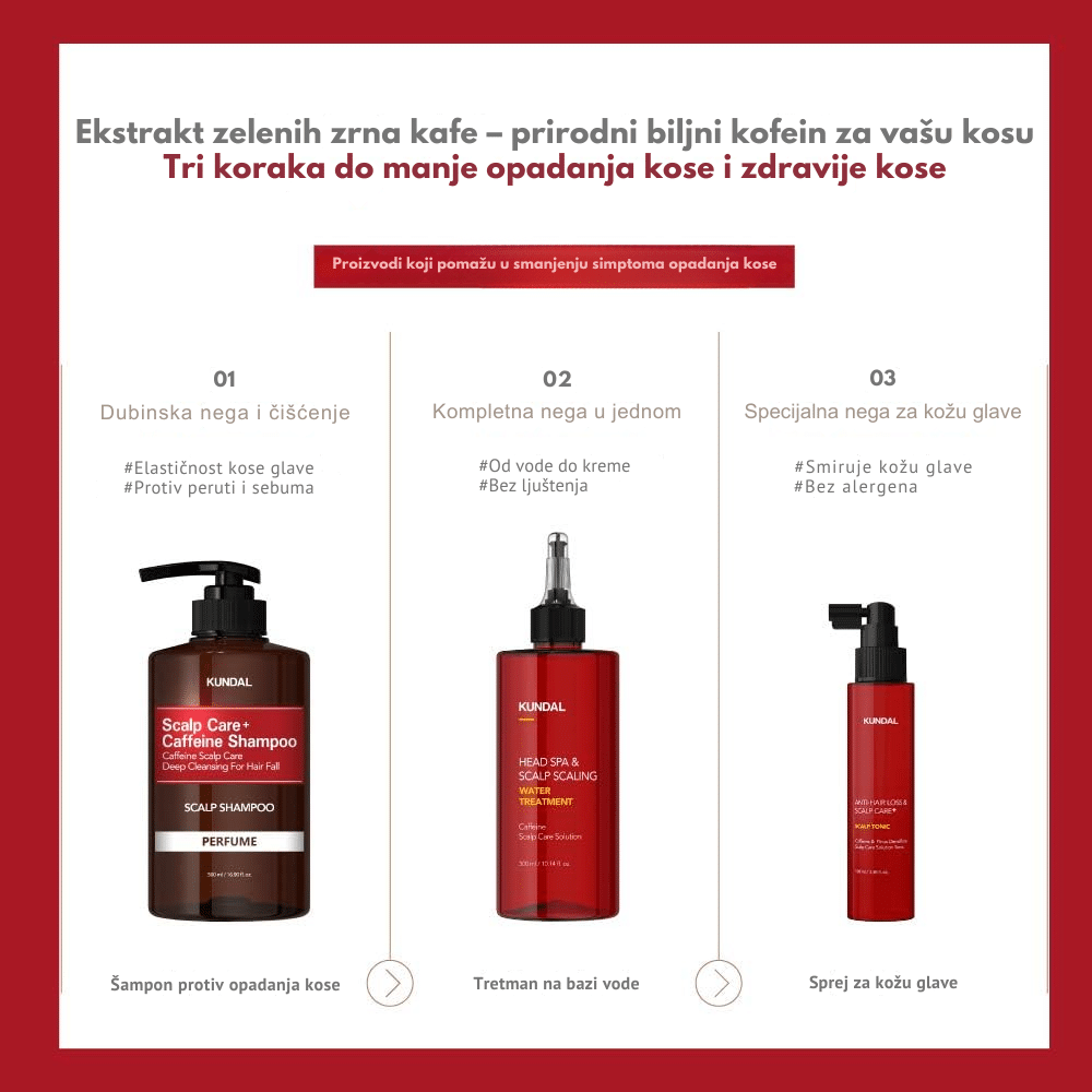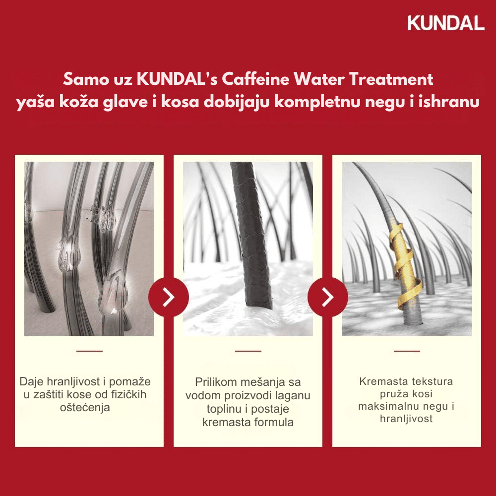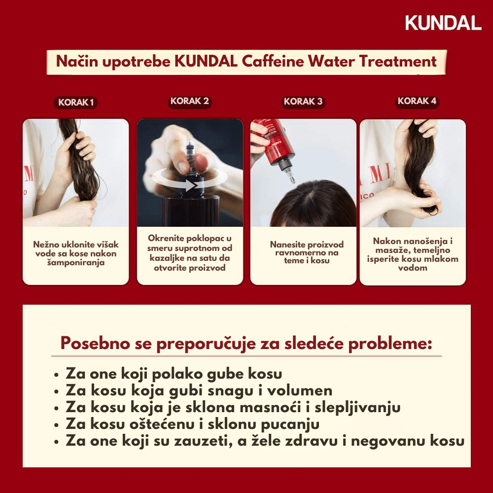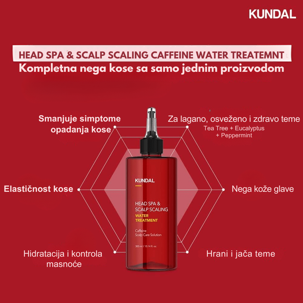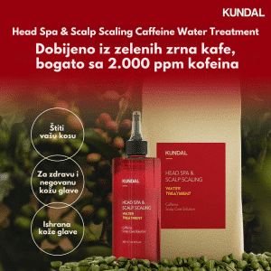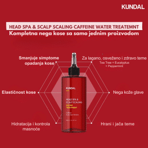 Kundal Head Spa & Scalp Scaling Caffeine Water Treatment je lagani tretman za vlasište i koren kose koji dubinski čisti, umiruje i jača kosu od samog korena. Formulisan sa kofeinom, biotinom i mentolom, ovaj tretman stimuliše mikrocirkulaciju, smanjuje opadanje i podstiče rast kose, dok ekstrakti čajevca i ruzmarina pročišćavaju i osvežavaju teme. Pantenol i hijaluronska kiselina vraćaju vlagu i ravnotežu vlasištu, sprečavajući svrab i suvoću. Idealan je za masno ili oslabljeno vlasište i kosu bez volumena kojoj je potrebna detoksikacija i jačanje.