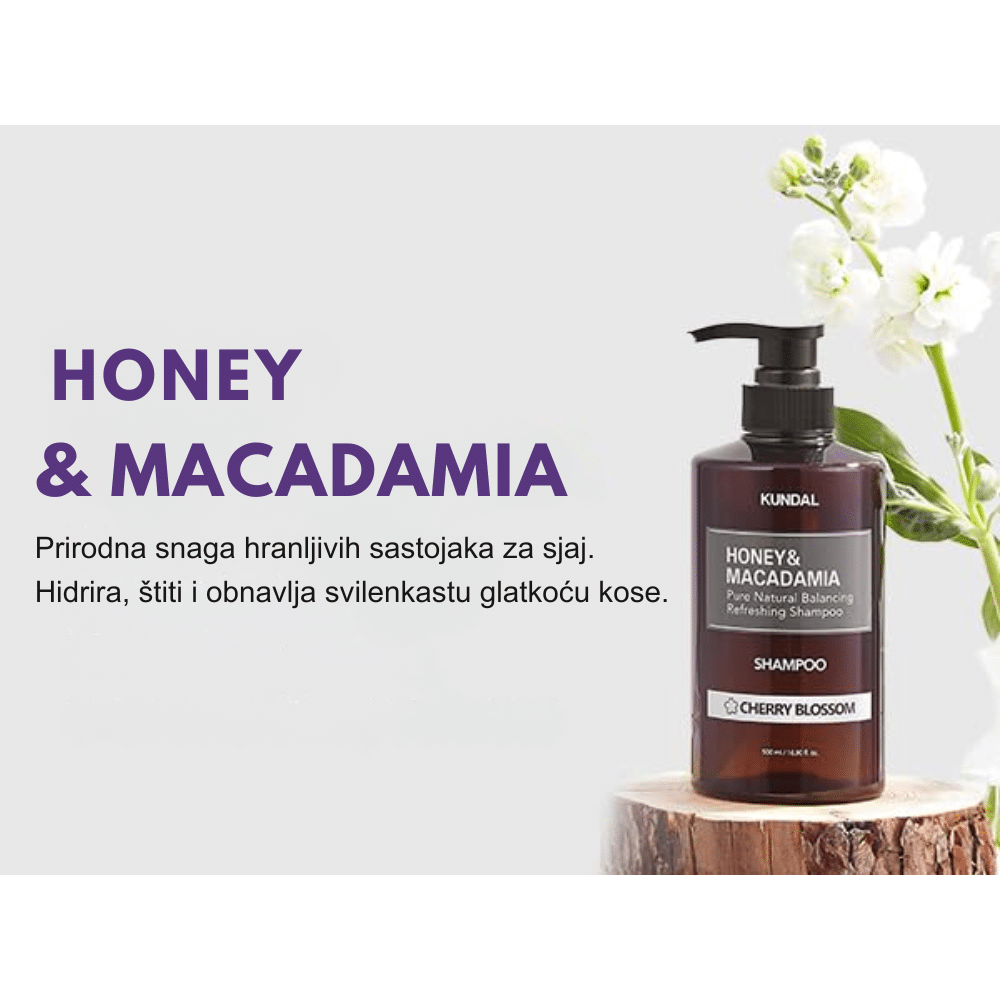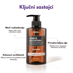 Kundal Honey & Macadamia Nature Shampoo Cherry Blossom je prirodni šampon koji nežno čisti, hidrira i jača kosu, obogaćen medom i uljem makadamije. Formula bogata aminokiselinama, keratinom i biljnim ekstraktima obnavlja oštećene vlasi, vraća im mekoću i elastičnost, dok ekstrakt trešnjinog cveta daje kosi svilenkast sjaj i prijatan, cvetni miris. Zahvaljujući blagim biljnim surfaktantima, ovaj šampon efikasno uklanja nečistoće i višak sebuma bez isušivanja. Idealan je za svakodnevnu upotrebu kod svih tipova kose, uključujući farbanu i osetljivu.
