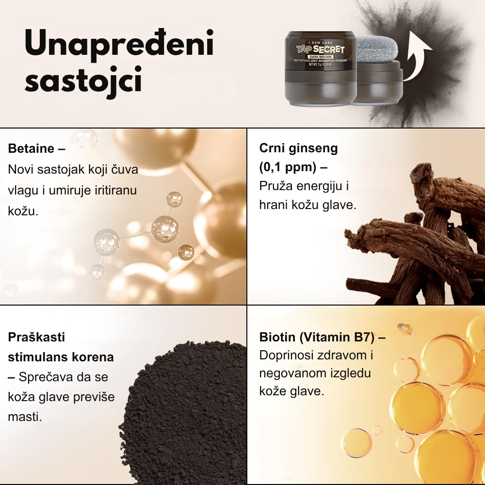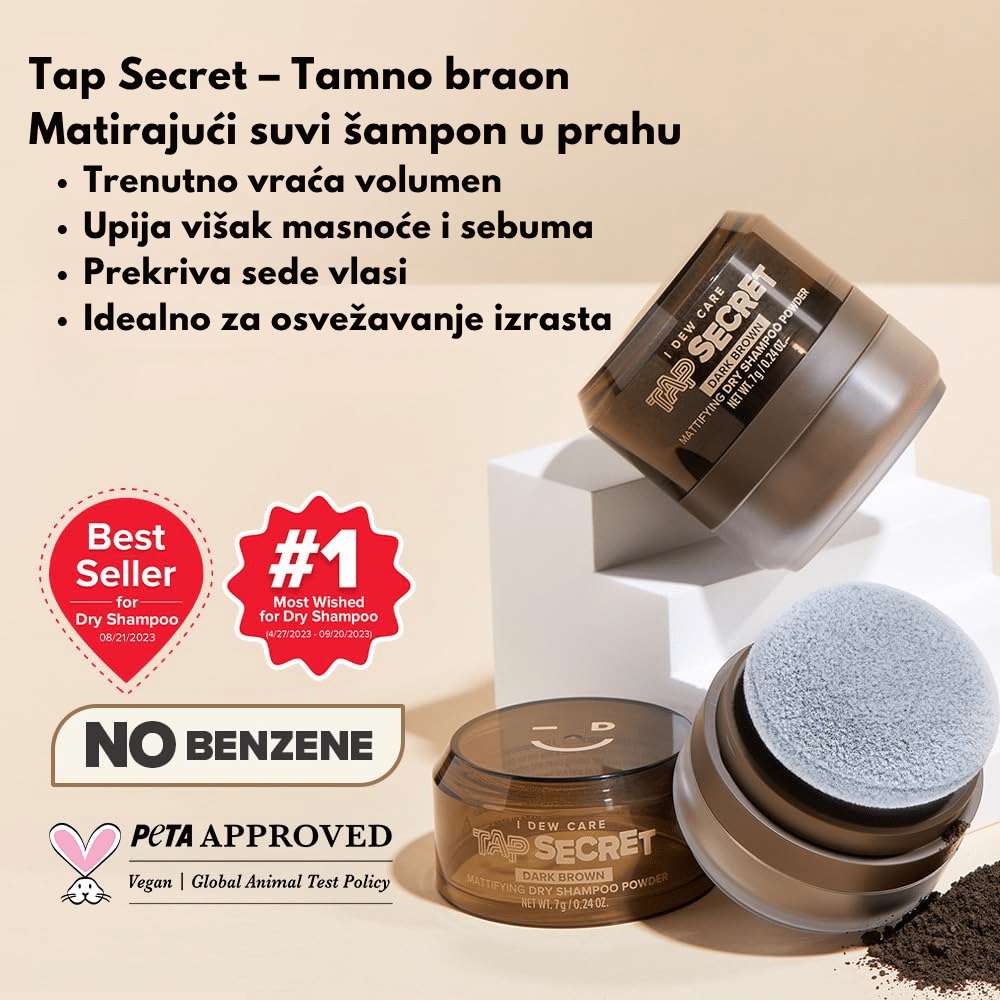 I DEW CARE Tap Secret Mattifying Dry Shampoo Powder Brown 7g je suvi šampon u prahu koji trenutno osvežava kosu, upija višak masnoće i pruža mat završnicu bez belih tragova. Formulisan posebno za osobe sa smeđom kosom, ovaj ultra-fini prah savršeno se stapa sa prirodnom bojom kose, omogućavajući brzo osveženje između pranja. Obogaćen je ključnim sastojcima poput biotina (vitamin B7), koji hrani teme i podstiče zdrav izgled kose, i crnog ženšena, koji stimuliše i promoviše zdravlje temena. Prah dolazi u kompaktnom i prenosivom pakovanju sa aplikatorom, omogućavajući lako nanošenje i osveženje kose u pokretu. Njegova formula bez aerosola pruža instant volumen i mat efekat, čineći kosu čistom i osveženom tokom celog dana.