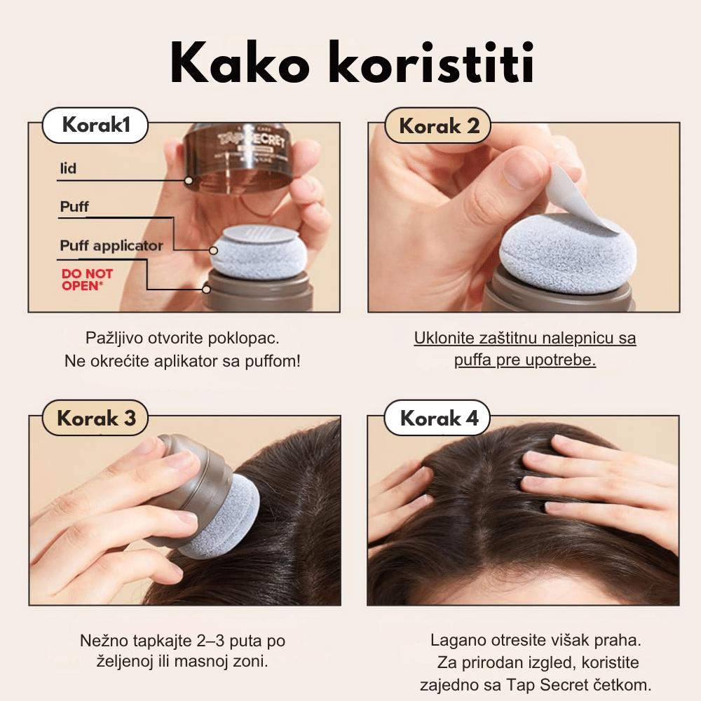Držite aplikator uspravno i tapkajte ga na željeno područje kose 3-5 puta, fokusirajući se na koren. Nakon nanošenja, prstima ili četkom uklonite višak praha i oblikujte kosu po želji. Izbegavajte kontakt sa očima. U slučaju iritacije, prekinite upotrebu i konsultujte se sa stručnjakom.