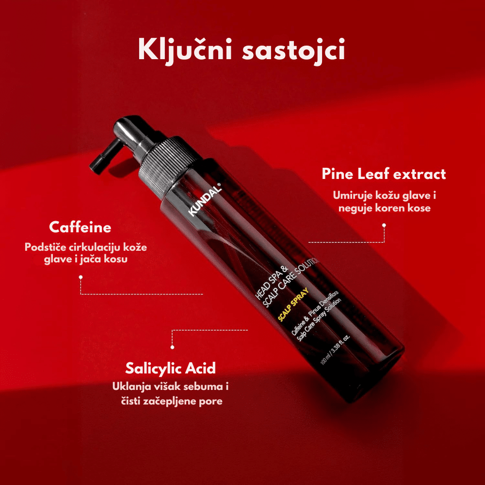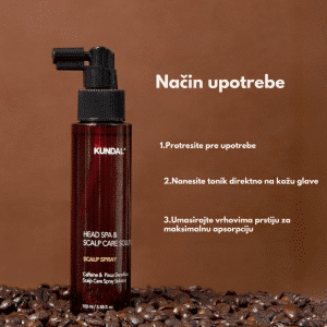 Kundal Head Spa & Scalp Care+ Scalp Tonic je osvežavajući tonik za teme glave koji stimuliše rast kose, smanjuje opadanje i umiruje vlasište. Formulisan sa biotinom, pantenolom, niacinamidom i mentolom, ovaj tonik hladi i osvežava teme, dok istovremeno jača koren kose i balansira nivo sebuma. Biljni ekstrakti čajevca, ruzmarina i mente deluju antibakterijski i pročišćavajuće, sprečavajući perut i iritacije. Lagana, nemasna formula brzo se upija i ostavlja prijatan osećaj čistoće i svežine.