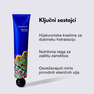 Pyunkang Yul Hand Cream Dancheong je bogata, hranljiva krema za ruke koja obezbeđuje dubinsku i dugotrajnu hidrataciju. Kremasta tekstura lako se razmazuje, brzo upija i ne ostavlja masan trag, dok kombinacija hranljivih biljnih ulja, shea putera i hijaluronske kiseline omekšava suvu, hrapavu ili ispucalu kožu ruku. Uz prirodan, biljni miris, krema neguje, štiti i održava ruke mekim i glatkim, čak i uz čestu upotrebu — idealna za svakodnevnu negu.
