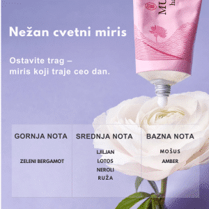 Veganska krema za ruke s muguet i lotus mirisom: hranljiva, brzo upija, bez lepljivosti – savršena za hidrataciju i mekoću tokom dana.