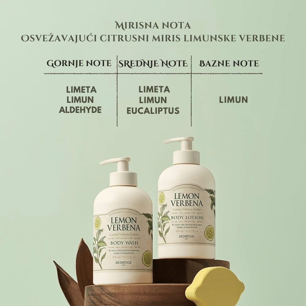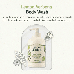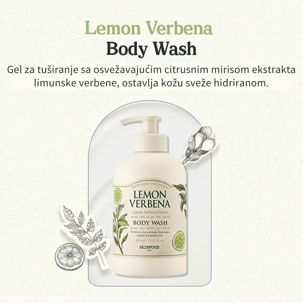 SKINFOOD Lemon Verbena Body Wash je osvežavajući gel za tuširanje koji kombinuje ekstrakt limuna i verbene kako bi nežno očistio kožu, uklonio nečistoće i ostavio telo glatkim, mekšim i revitalizovanim. Lagana citrusna pena umiruje, hidrira i pruža energizujući osećaj, dok biljni ekstrakti jačaju kožnu barijeru i osvežavaju umornu kožu. Idealno za svakodnevnu upotrebu i sve koji vole čist, lagan i prirodno osvežavajući miris.