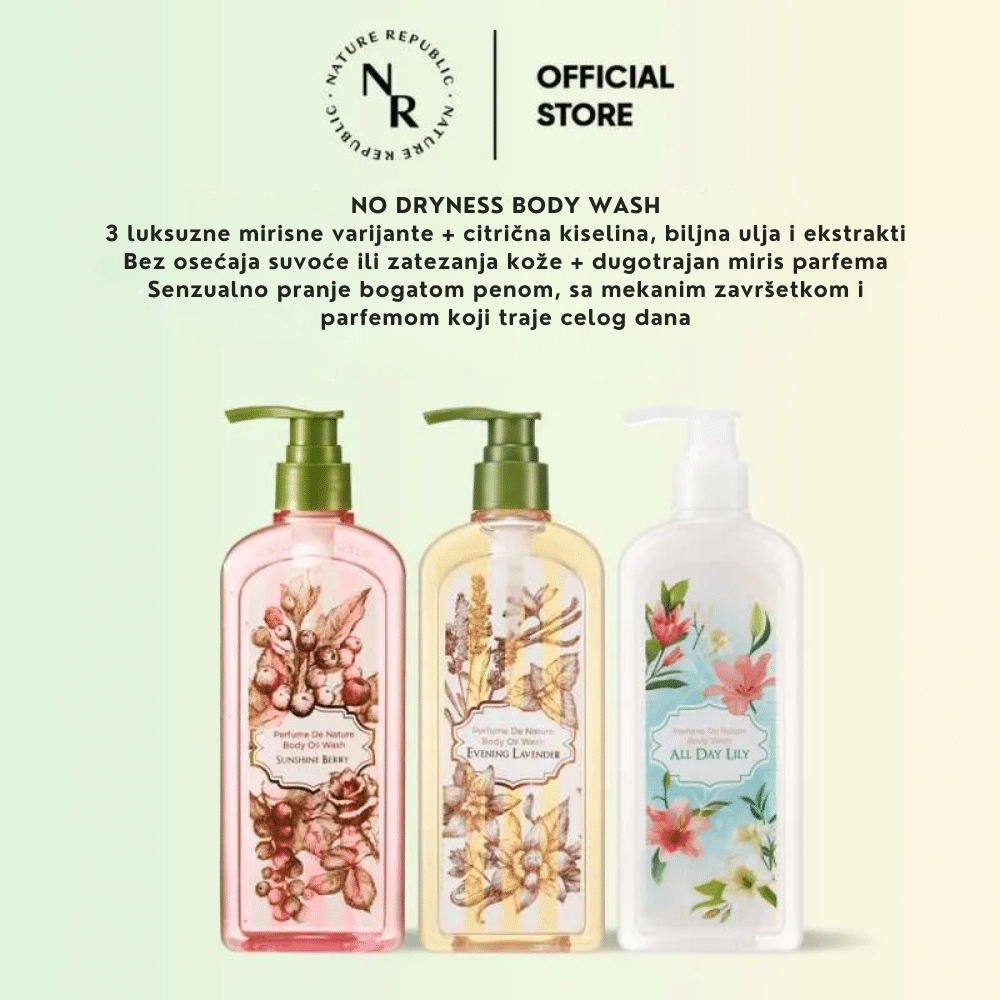 Nature Republic Perfume De Nature Body Oil Wash u mirisnoj noti Allday Lily predstavlja luksuzno iskustvo tuširanja koje kombinuje dubinsko čišćenje sa intenzivnom ishranom biljnih ulja. Za razliku od klasičnih gelova, ova uljana kupka pri kontaktu sa vodom stvara bogatu, kremastu penu koja nežno uklanja nečistoće bez narušavanja prirodne barijere kože. Formula je obogaćena dragocenim uljima koja sprečavaju osećaj zatezanja nakon pranja, ostavljajući kožu svilenkasto mekom i hidriranom. Mirisna nota belog ljiljana pruža sofisticiran i čist cvetni miris koji se zadržava na telu dugo nakon tuširanja, pružajući osećaj svežine kao da ste koristili parfem. Ovaj proizvod je idealan za suvu i osetljivu kožu, jer pruža “2-u-1” efekat: čisti poput sapuna, a neguje poput ulja za telo. Rezultat je savršeno čista, blistava koža koja odiše elegancijom i mekoćom.