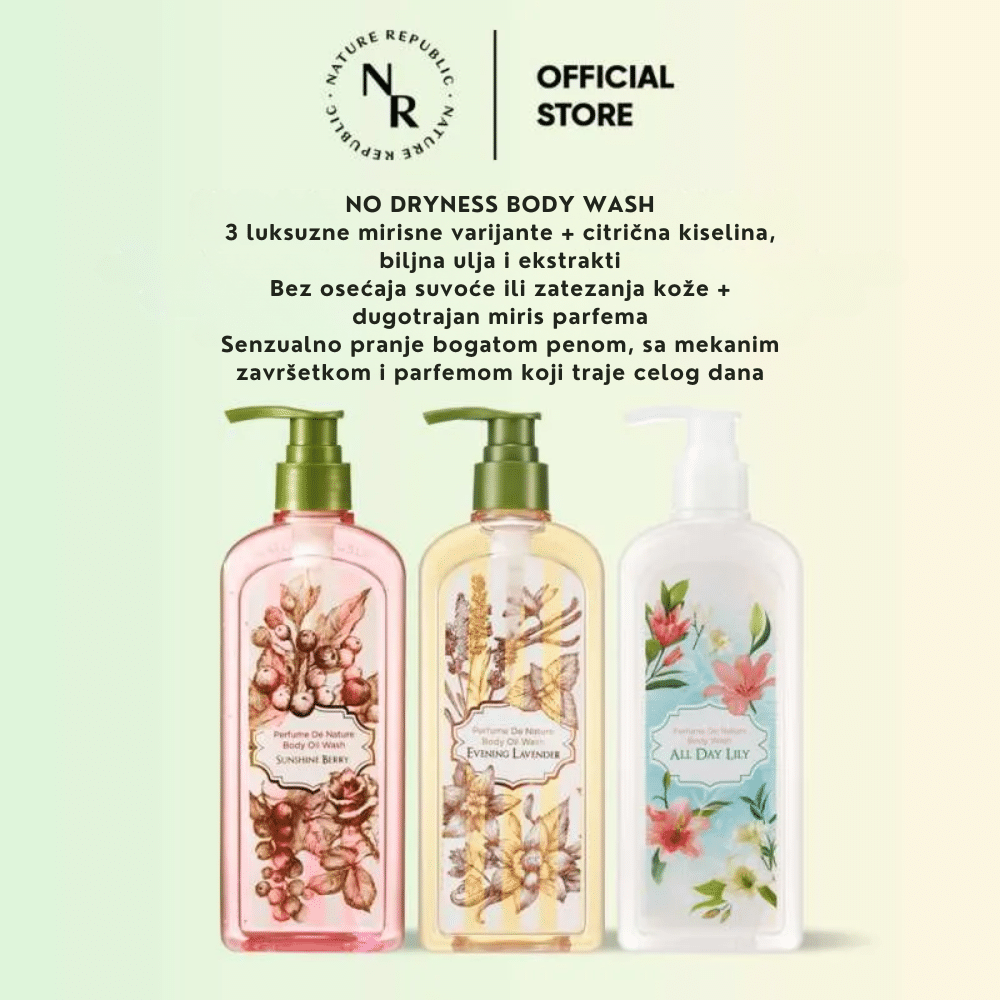 Nature Republic Perfume De Nature Body Oil Wash u varijanti Sunshine Berry predstavlja osvežavajući i energetski ritual tuširanja koji kombinuje dubinsko čišćenje sa revitalizujućom snagom bobičastog voća. Ova luksuzna uljana kupka u dodiru sa vodom stvara bogatu, baršunastu penu koja nežno uklanja nečistoće dok istovremeno hrani kožu dragocenim biljnim uljima suncokreta, argana i jojobe. Glavni adut ovog proizvoda je razigrana i slatka mirisna nota zrelog bobičastog voća, koja trenutno popravlja raspoloženje i ostavlja dugotrajan, sunčan miris na vašoj koži. Za razliku od običnih gelova koji mogu isušiti kožu, ova uljana formula čuva prirodnu vlažnost i ostavlja telo svilenkasto mekim i blistavim. Idealna je za jutarnje tuširanje jer pruža instant osećaj svežine i vitalnosti, pretvarajući kupatilo u mirisnu baštu punu sunca. Rezultat je savršeno čista, nahranjena i mirisna koža koja odiše energijom tokom celog dana.