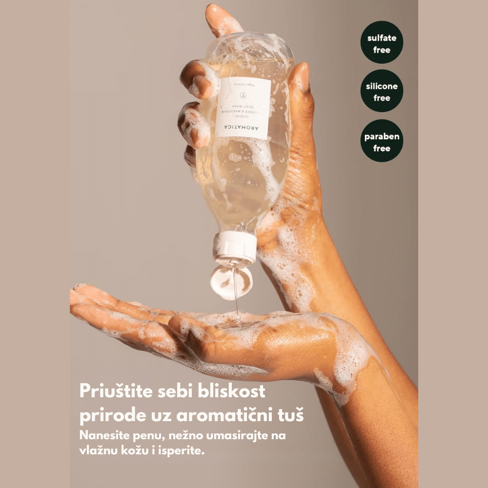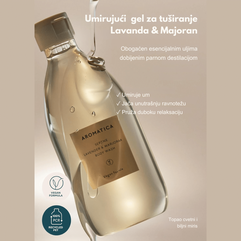 Aromatica Serene Body Wash Lavender & Marjoram je umirujući gel za tuširanje koji nežno čisti i relaksira telo i um uz prirodnu aromaterapijsku mešavinu lavande i majorana. Formulisan sa biljnim surfaktantima, aloe verom i eteričnim uljima, ovaj veganski gel čisti bez isušivanja i pomaže u održavanju prirodne vlažnosti kože. Njegov umirujući miris lavande oslobađa napetost i stres, pretvarajući svakodnevno tuširanje u opuštajući spa ritual. Pogodan za sve tipove kože, uključujući i osetljivu.
