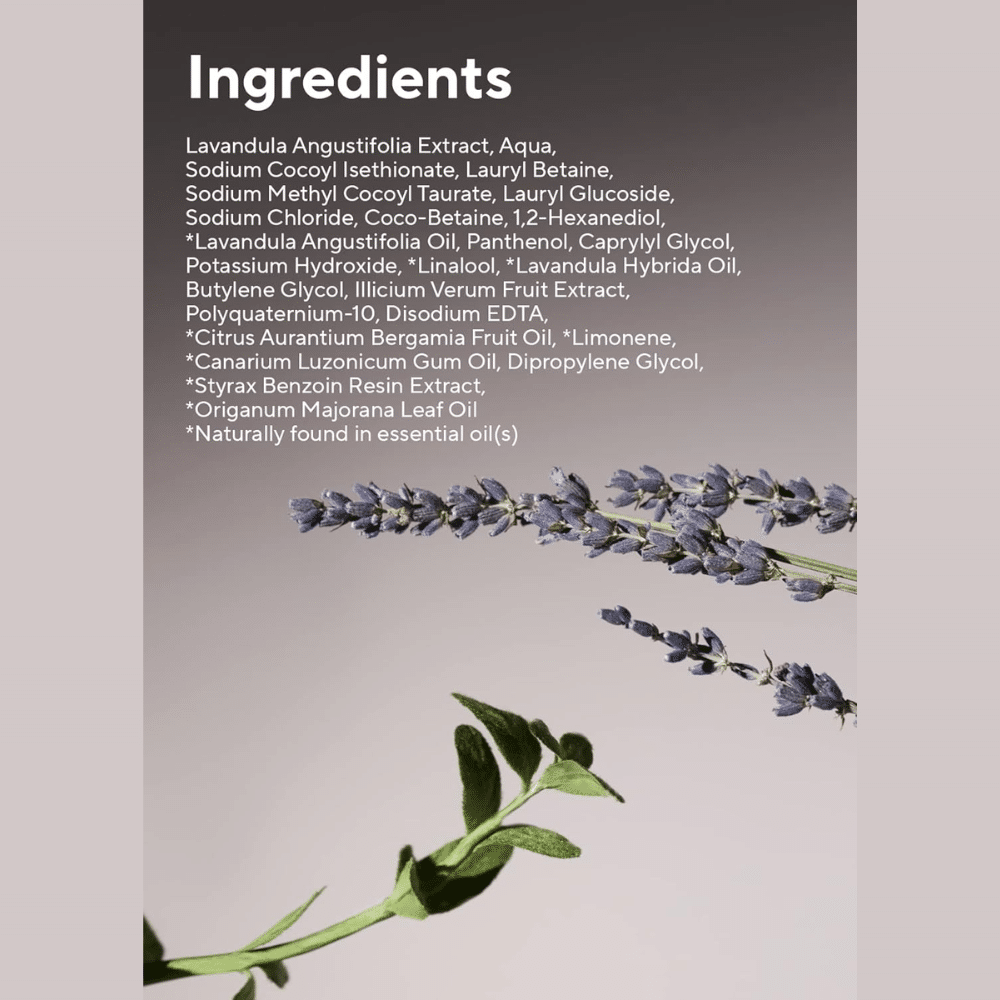 Water, Lavandula Angustifolia (Lavender) Oil, Origanum Majorana Leaf Oil, Aloe Barbadensis Leaf Extract, Coco-Glucoside, Glycerin, Sodium Cocoyl Glutamate, Citric Acid, Tocopherol, Betaine, Disodium EDTA, Ethylhexylglycerin, Phenoxyethanol.
