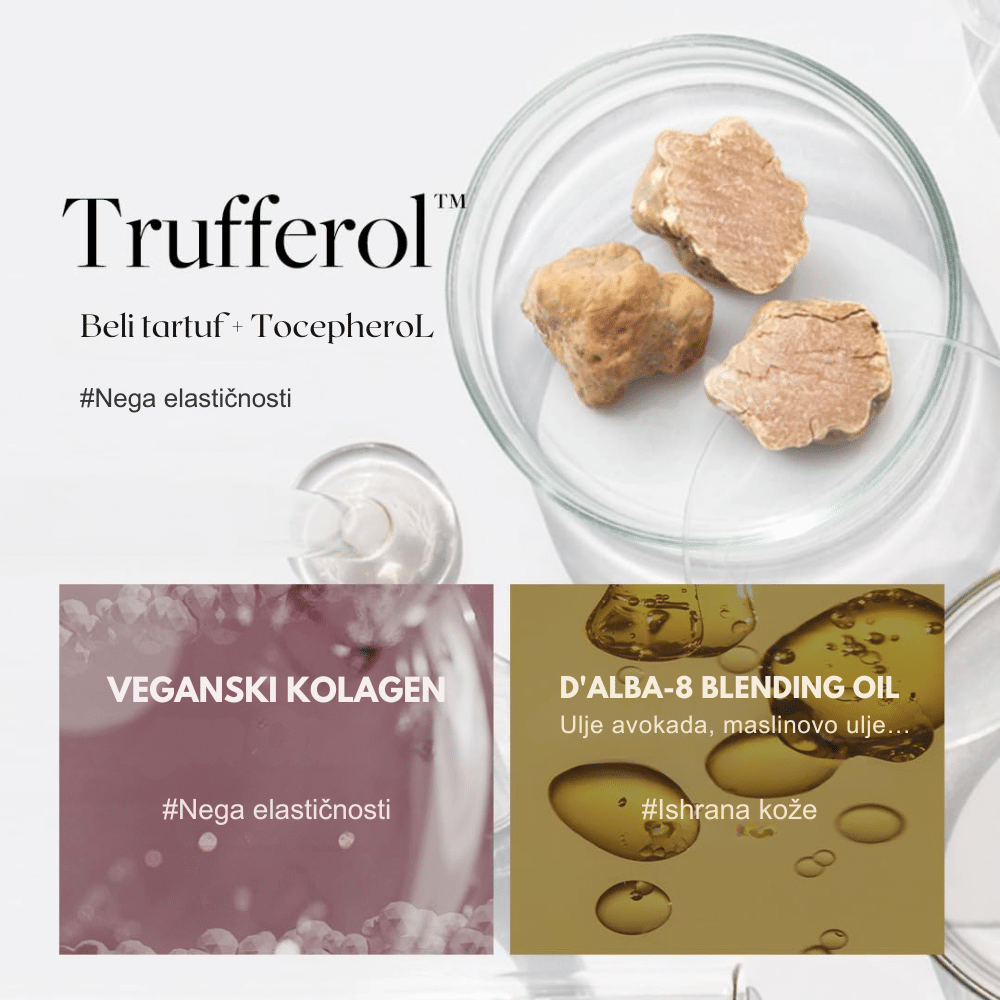 d’Alba White Truffle Oil Serum Body Cleanser je luksuzni veganski gel za tuširanje sa ekstraktom belog tartufa i bogatim serumskim uljima koji nežno uklanja nečistoće sa kože tela, a istovremeno dubinski hidrira i održava prirodnu vlažnost. Formulisan sa blagim pH vrednostima i kombinacijom više biljnih ulja, pruža bogatu, kremastu penu koja očisti bez isušivanja i ostavlja kožu mekom, glatkom i negovanom posle svakog tuširanja