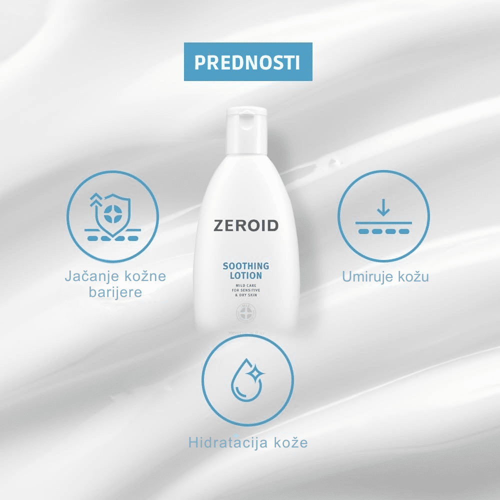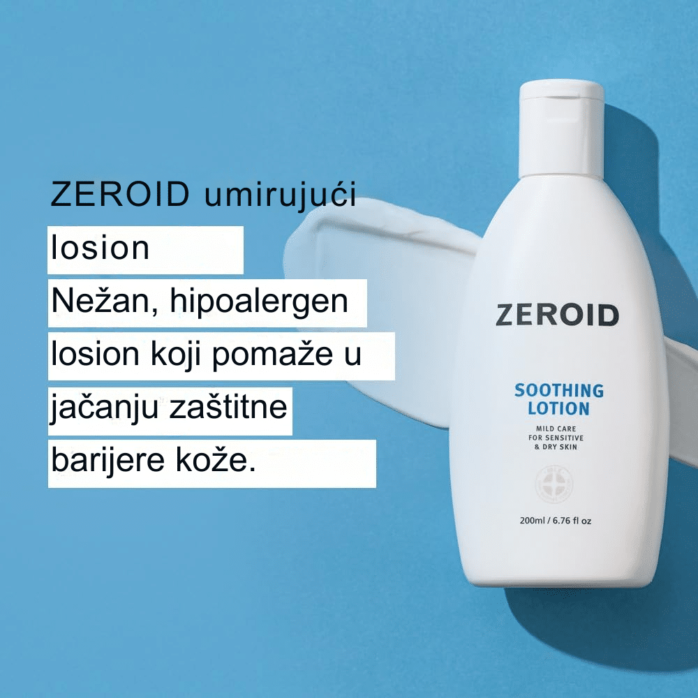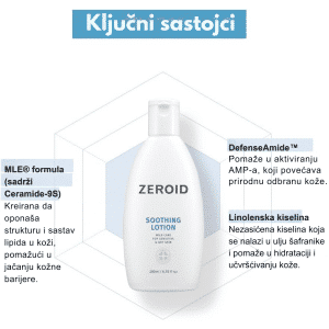 ZEROID Soothing Lotion je lagani, hipoalergeni tretman dizajniran za svakodnevnu negu i smirivanje osetljive, iritirane i reaktivne kože. Za razliku od Intensive linije koja je fokusirana na ekstremnu suvoću, Soothing linija je kreirana da pruži optimalnu hidrataciju bez osećaja težine, što je čini idealnom za normalnu, kombinovanu i masnu kožu koja je istovremeno osetljiva. Ovaj losion koristi patentiranu MLE® (Multi-Lamellar Emulsion) tehnologiju koja obnavlja zaštitnu barijeru kože simulirajući njenu prirodnu strukturu. Formula je obogaćena Defensamide® kompleksom koji jača imunitet kože i pantenolom koji trenutno ublažava crvenilo i peckanje. Losion se izuzetno brzo upija, ne ostavljajući mastan trag niti zapušene pore, čineći kožu mekom, balansiranim i zaštićenom od spoljnih agresora. Kao i svi Zeroid proizvodi, ne sadrži parabene, mirise, boje niti druge uobičajene iritante, što ga čini bezbednim izborom za celu porodicu, uključujući decu i bebe.