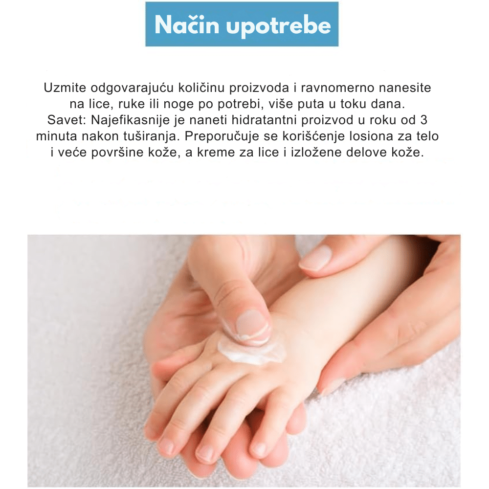 Nanesite odgovarajuću količinu losiona na čisto i suvo lice ili telo nakon tuširanja ili pranja. Nežno umasirajte dok se potpuno ne upije. Proizvod se može koristiti više puta dnevno na delovima kože koji su skloni iritacijama ili crvenilu. Zbog svoje lagane teksture, odličan je kao dnevna hidratantna podloga pre nanošenja kreme sa zaštitnim faktorom ili šminke. Proizvod je namenjen isključivo za spoljnu upotrebu; izbegavajte direktan kontakt sa očima. U slučaju bilo kakve reakcije, prekinite sa upotrebom. Čuvati na sobnoj temperaturi.
