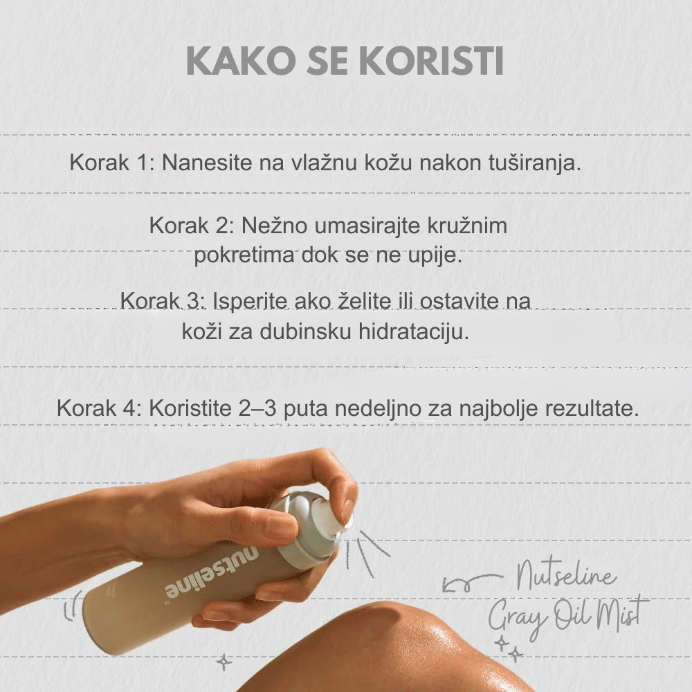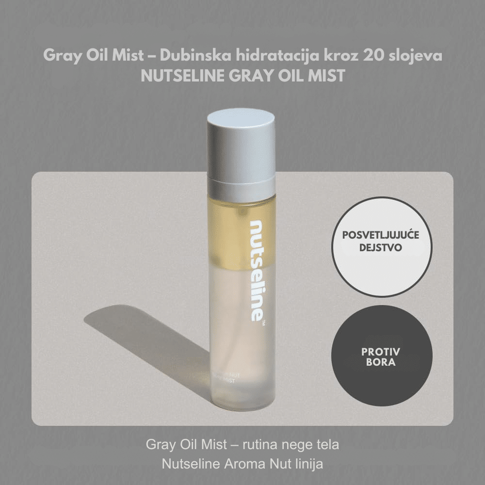 Nutseline Aroma Nut Grey Body Mist je osvežavajući mist za telo koji pruža lagan miris i hidrataciju tokom dana.