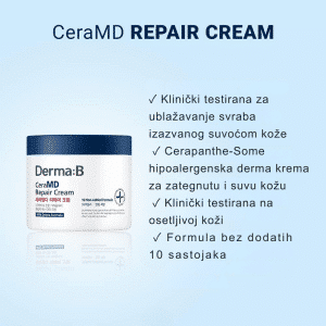Derma:B CeraMD Repair Cream 430 ml je bogata, intenzivno hidratantna krema za telo sa ceramidima i pantenolom, dizajnirana da obnovi i ojača zaštitnu barijeru kože, smanji osećaj zatezanja i svraba uzrokovanog suvoćom i pruži dugotrajnu hidrataciju bez iritacija. Formula bez mirisa i dermatološki testirana čini je idealnim izborom za suvu, osetljivu i dehidriranu kožu koja traži umirujuću i hranljivu negu.