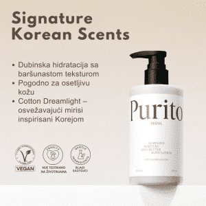 Purito Seoul je korejski kozmetički brend koji se fokusira na korišćenje prirodnih sastojaka i održive prakse kako bi pružio efikasnu i sigurnu negu kože. Njihova filozofija se temelji na jednostavnosti i transparentnosti, sa naglaskom na proizvode koji su pogodni za sve tipove kože, uključujući osetljivu. Brend je poznat po liniji proizvoda Wonder Releaf Centella, koja koristi centellu asiatiku kao ključni sastojak za brzo umirenje crvenila i iritacija kože. Ovi proizvodi su veganski, cruelty-free i formulirani sa pažljivo odabranim prirodnim sastojcima. Purito Seoul se zalaže za ekološki prihvatljivo pakovanje i transparentnost u deklaraciji sastojaka, što ih čini pouzdanim izborom za one koji traže odgovornu negu kože.