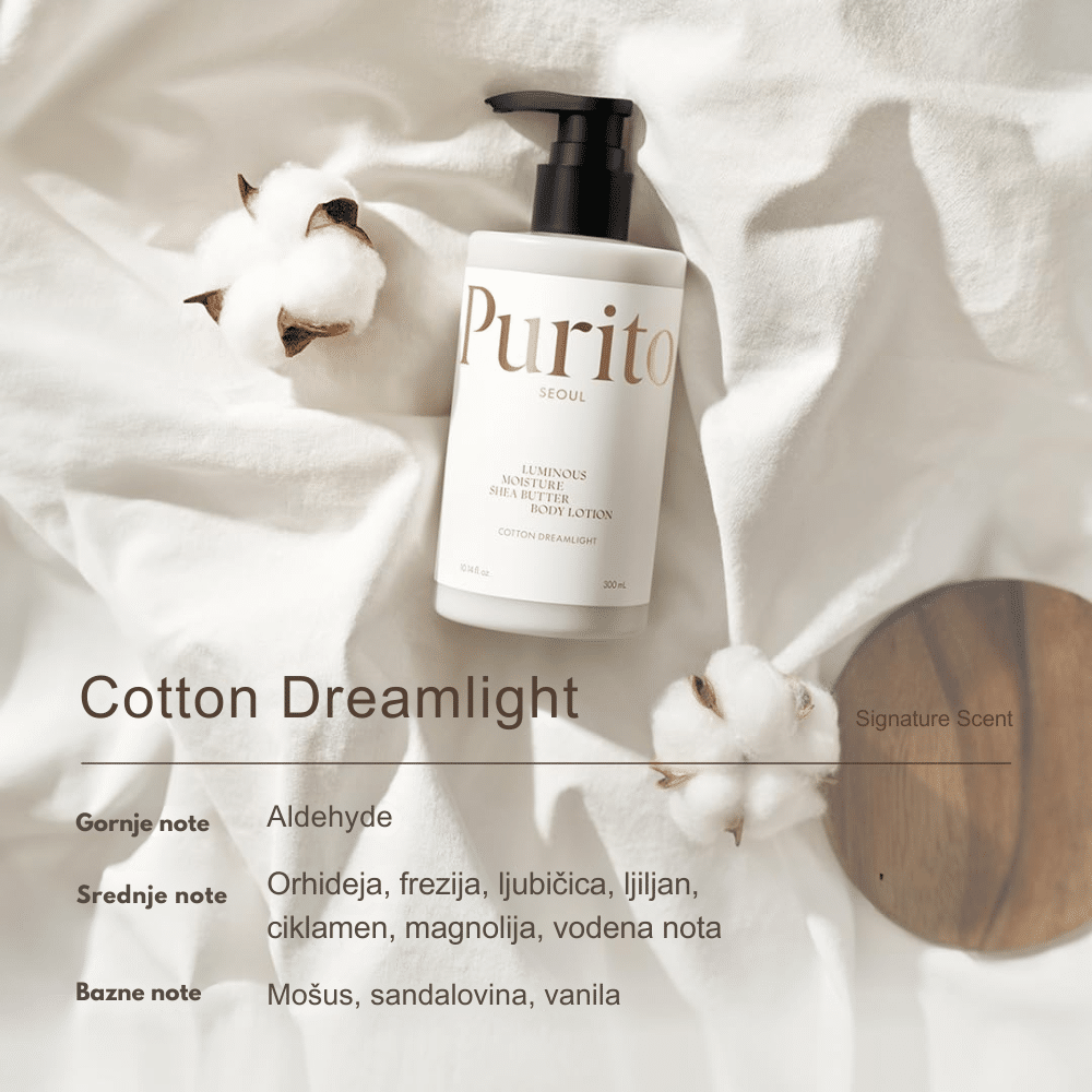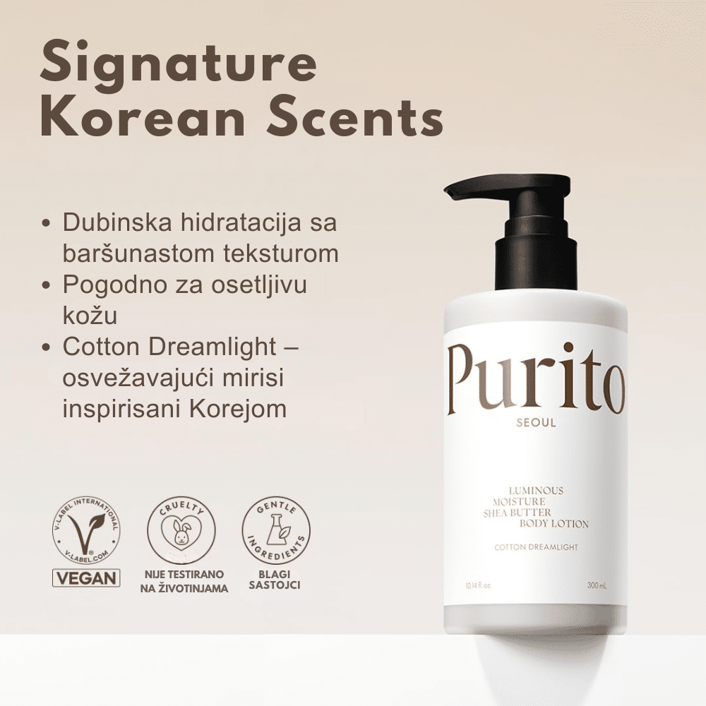 Purito Seoul Luminous Moisture Shea Butter Body Lotion (Cotton Dreamlight) je hranljivi losion za telo koji kombinuje intenzivnu hidrataciju, umirujuće delovanje i laganu teksturu koja se brzo upija. Obogaćen shea buterom, hijaluronskom kiselinom i umirujućim ekstraktima biljaka, ovaj losion dubinski hidrira kožu tela, obnavlja barijeru i ostavlja je glatkom, nežnom i mekom. Formula bez teškog osećaja i prijatan „Cotton Dreamlight“ miris čine ga idealnim za svakodnevnu negu kože.