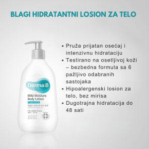 Derma:B Mild Moisture Body Lotion je lagani, svakodnevni losion za telo formulisan za dugotrajnu hidrataciju i očuvanje prirodne barijere kože. Sadrži pantenol i biljne ekstrakte koji umiruju kožu, ublažavaju osećaj zatezanja i pružaju optimalan nivo vlage bez masnog ili lepljivog osećaja. Blaga formula čini ovaj losion pogodnim i za osetljivu kožu, kao i za svakodnevnu upotrebu cele porodice.