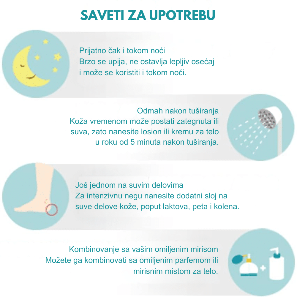 Nanesite odgovarajuću količinu losiona na čistu i suvu kožu tela i nežno umasirajte dok se potpuno ne upije. Može se koristiti svakodnevno, ujutro i uveče. Prekinite upotrebu ukoliko dođe do iritacije.