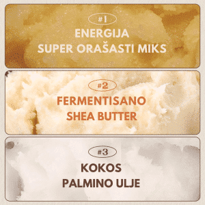 Shea Butter je prirodni maslac dobijen iz plodova drveta Shea, poznat po svojim intenzivnim hranljivim i hidratantnim svojstvima. Bogat je masnim kiselinama, vitaminima A i E, koji dubinski neguju kožu, pomažu u regeneraciji i štite je od isušivanja. Zahvaljujući svojim umirujućim i antiinflamatornim svojstvima, shea butter je idealan za tretiranje suve, ispucale i iritirane kože. Takođe, pomaže u obnavljanju prirodne barijere kože, pružajući dugotrajnu hidrataciju i mekoću. Iz tih razloga, ši buter je čest sastojak u kozmetičkim proizvodima za negu lica, tela, usana i kose.