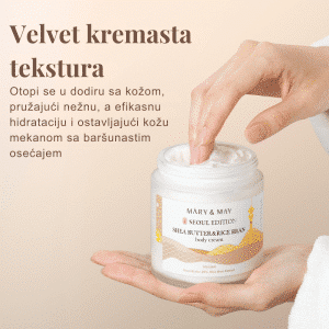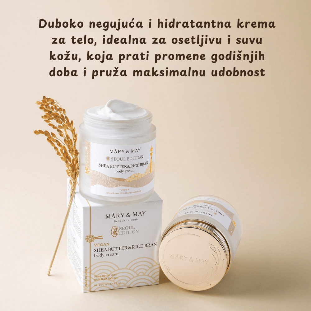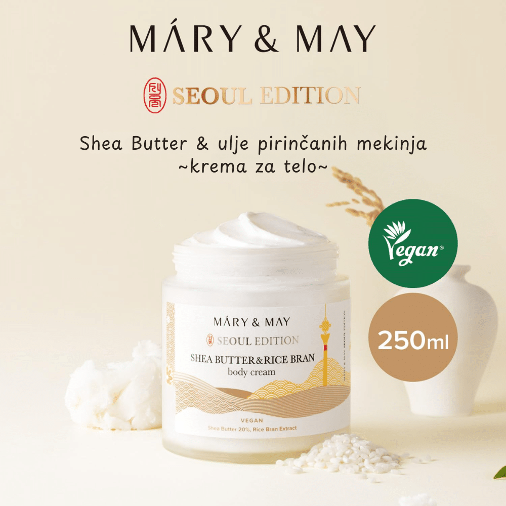 Mary&May Shea Butter & Rice Bran Body Cream 250 ml je premium veganska krema za telo obogaćena 20 % visokokoncentrovane shea butter, rice bran ekstraktom i ceramidom NP, dizajnirana baš za suvu i osetljivu kožu. Ova bogata formula pruža intenzivnu hidrataciju, ostavljajući kožu mekom, glatkom i baršunasto mat – bez masnog osećaja. Shea butter dubinski hrani, dok rice bran donosi vitamine i aminokiseline za zdrav i blistav ten. Ceramide jača kožnu barijeru, čineći je otpornijom na isušivanje. крема se topi pri kontaktu s kožom, brzo se upija, a koža ostaje osvežena i hidrirana cele dane. Bez mirisa, idealna je za one koji su osetljivi na parfeme i žele nežnu svakodnevnu negu. Dermatološki testirana i EWG green, ova krema spaja luxuznu negu sa čistom, ekološki osvešćenom formulom.