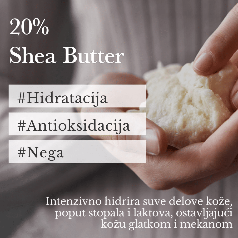 Shea Butter je prirodni maslac dobijen iz plodova drveta Shea, poznat po svojim intenzivnim hranljivim i hidratantnim svojstvima. Bogat je masnim kiselinama, vitaminima A i E, koji dubinski neguju kožu, pomažu u regeneraciji i štite je od isušivanja. Zahvaljujući svojim umirujućim i antiinflamatornim svojstvima, shea butter je idealan za tretiranje suve, ispucale i iritirane kože. Takođe, pomaže u obnavljanju prirodne barijere kože, pružajući dugotrajnu hidrataciju i mekoću. Iz tih razloga, ši buter je čest sastojak u kozmetičkim proizvodima za negu lica, tela, usana i kose.
