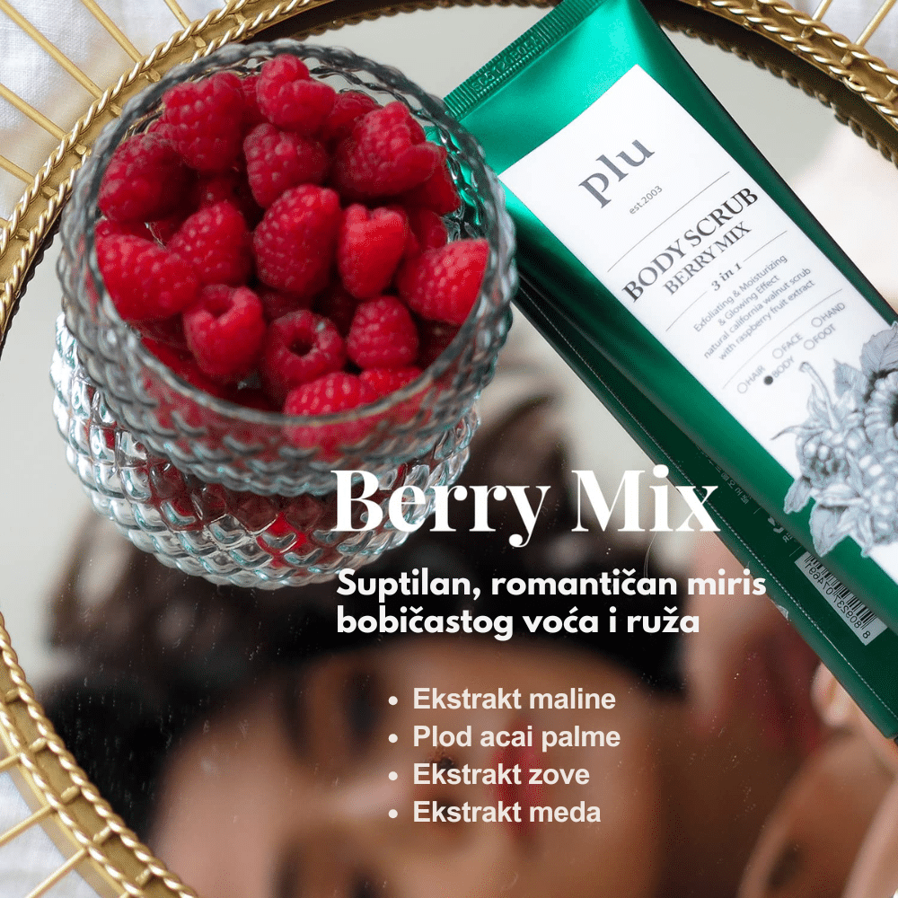 Plu Body Scrub Berry Mix je hranljivi šećerni piling za telo koji kombinuje prirodne eksfolijantne čestice i bogata biljna ulja, ostavljajući kožu glatkom, mekanom i hidriranom. Shea puter, ulje makadamije i ulje jojobe obnavljaju suvu i hrapavu kožu, dok mešavina voćnih i cvetnih ekstrakata daje svež, sladak miris inspirisan šumskim bobicama. Piling uklanja mrtve ćelije, poboljšava teksturu kože i vraća joj prirodan sjaj već nakon prvog korišćenja.