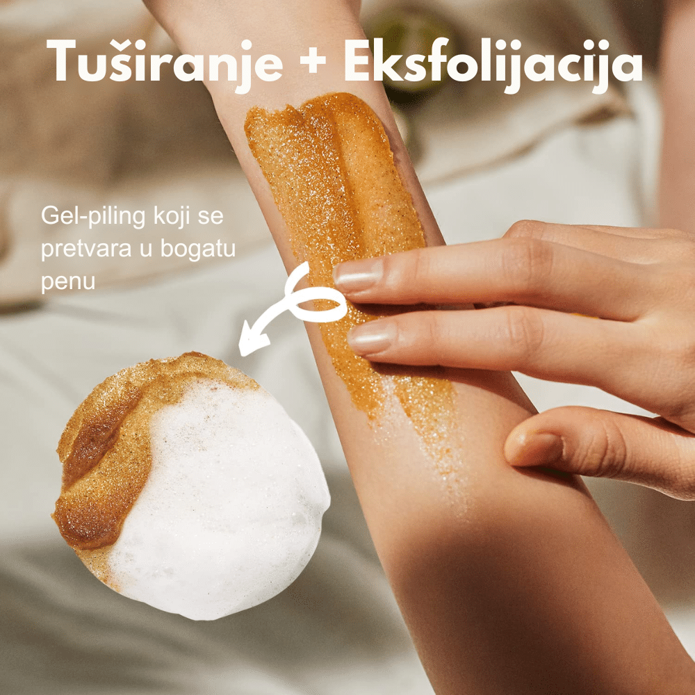 Naneti piling na vlažnu kožu i masirati kružnim pokretima, posebno na suvim i grubljim delovima. Isprati mlakom vodom. Koristiti 2–3 puta nedeljno. Ne nanositi na iritiranu ili oštećenu kožu.