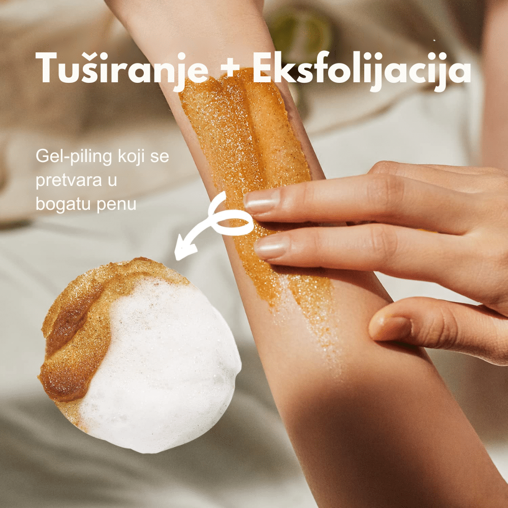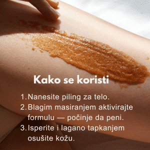 Naneti piling na vlažnu kožu i masirati kružnim pokretima, posebno na suvim i grubljim delovima. Isprati mlakom vodom. Koristiti 2–3 puta nedeljno. Ne nanositi na iritiranu ili oštećenu kožu.