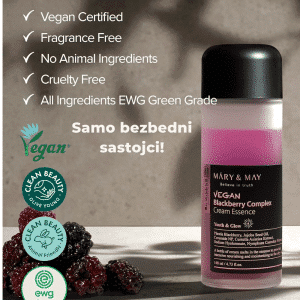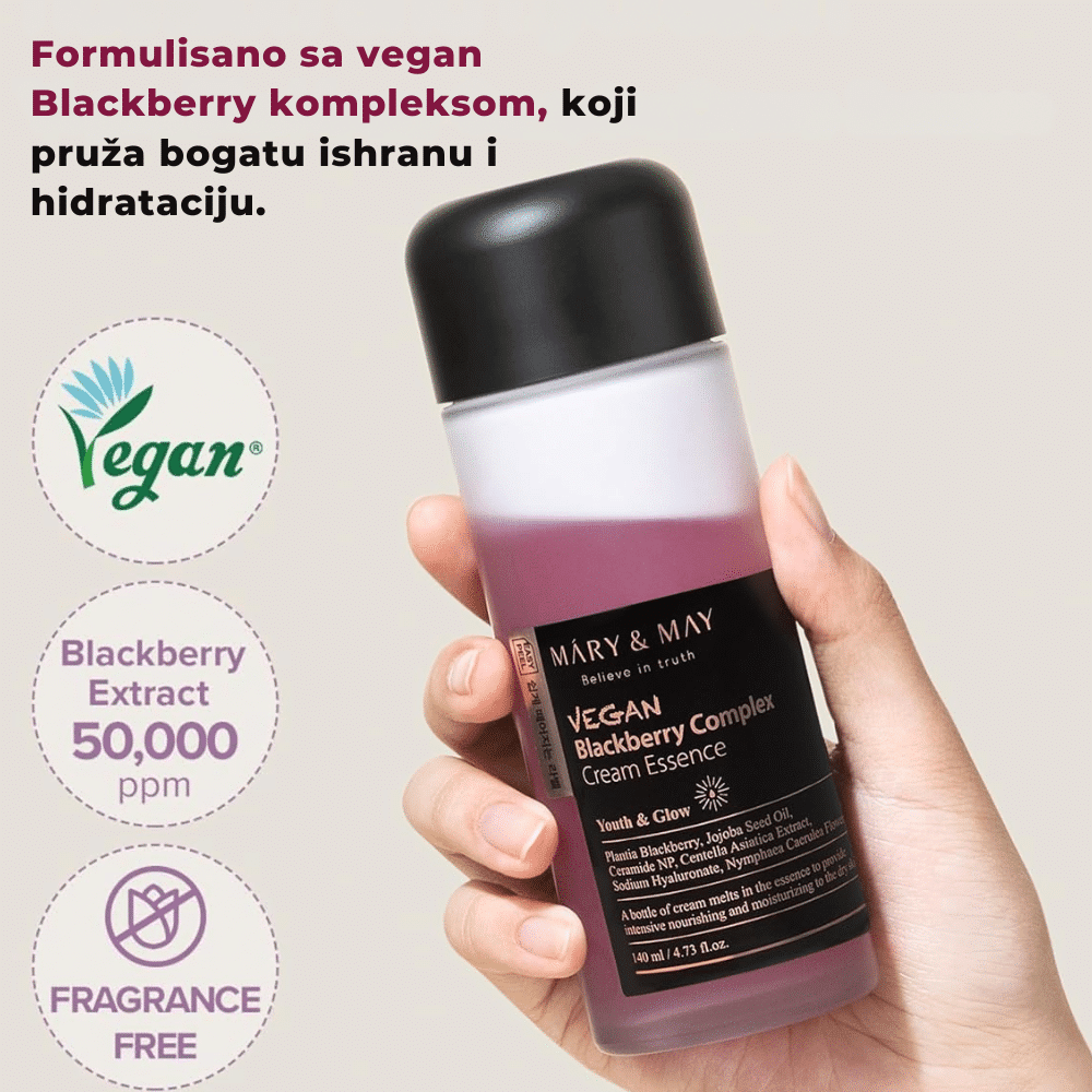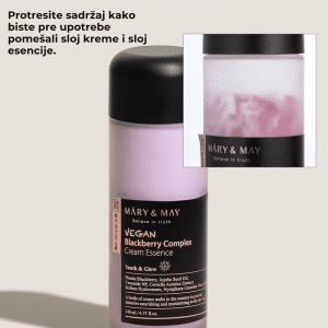 Mary&May Vegan Blackberry Complex Cream Essence je lagana, dvostruka emulzija (double phase) koja kombinuje hranljivu kremu sa osvežavajućom esencijom. Obogaćena je visokim koncentracijama 50 000 ppm ekstrakta borovnice, 100 000 ppm plavog lotosa, 80 000 ppm jojoba ulja, uz dodatak Ceramide NP, Centella Asiatica i više oblika hijaluronske kiseline. Ovaj vegan, hipoalergični proizvod jača barijeru kože, hidrira, pruža sjaj i štiti od slobodnih radikala, bez osećaja težine ili masnoće.