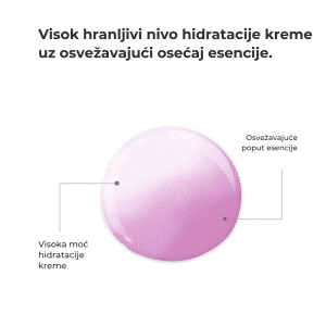 Lagani, dvostepeni krem‑esencijalni tretman s visokim procenatima borovnice, lotosa i jojobe, za hidrataciju, sjaj i regeneraciju, bez masnog traga.